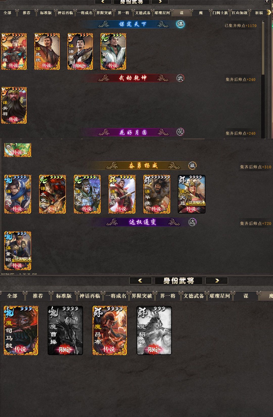 谋诸葛亮族荀彧+大将军+37祈福24祈愿521将大将军+7翻19大18小祈福24祈愿(祈福灯差2)+族吴苋(琳琅动+双传)族荀谌周群张华(琳琅动)夏侯玄文鸯(琳琅动+传)神张角(限)+族荀彧(琳琅动)谋诸葛亮(琳琅动+三动+传)族钟琰吕玲绮(流金动)蒋琬费祎(传)周处(琳琅动+动)二曹(动)冯方女(琳琅动+动)潘淑(传)龙凤(双动)曹爽二袁(动)曹纯张琪瑛(传)徐荣(限动)曹婴(限动)鲍三娘(动)关索(动)+SP曹操(传)族荀莳族钟会(琳琅动+动)族杨修(动)魔司马懿(琳琅动)魔吕布(琳琅动)谋姜维(琳琅动+双动+传)谋庞统(琳琅动+双动+限)谋鲁肃(动+三传)谋关羽(四动+限+传)谋小乔(琳琅动+三动)谋邓艾(双动+限)谋孙坚(动+传)谋袁绍(双传)陆郁生(传)丁尚涴(动)胡金定(动)孙茹(双传)董詡(传)武安国吕伯奢界徐盛(双琳琅动+动)界张春华(琳琅动+动)界曹植(琳琅动+动+传)+族荀采(动)族荀攸(传)族王允等!全国战!504五阶!岁节文和花好谋定全齐+武动全齐(张飞张辽典韦太史慈甘宁马超吕布许褚动)!1854皮肤117限动43琳琅动!16传说秀12动画秀7线下秀!
