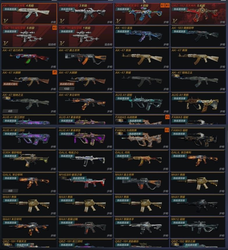 主武:AK103远古神鹰4阶段 M4A1诗剑问道3阶段 QBZ191虹影龙心4阶段 QBZ192混天神兵5阶段 VSK94星际穿越5阶段 VSK94星际穿越1阶段 AK103雷龙 AK103暗黑铠甲 AK47动力机车 AK47废土世界 AK47贵族X2 AK47火麒麟 AK47黑曜 AK47陆地之王 AK47末日审判 AUGA1超能 AUGA1青鹤 AUGA1赛派对 AUGA1紫金夜影 FAMAS斗战胜佛 FAMAS镭射 G36K望舒观澜 GALIL电弧之心 GALIL丹凤 GALIL末日审判 M14EBR破浪之锋 M4A1废土世界 M4A1贵族X4 M4A1黑曜 M4A1末日审判 M4A1能量过载 M4A1银翼杀手 MK12超能 QBZ191赛派对 QBZ191武韵秦影 QBZ192魔法少女蕾安娜 QBZ192虚空源能 R5RGP雷龙 R5RGP枪娘次元大冒险