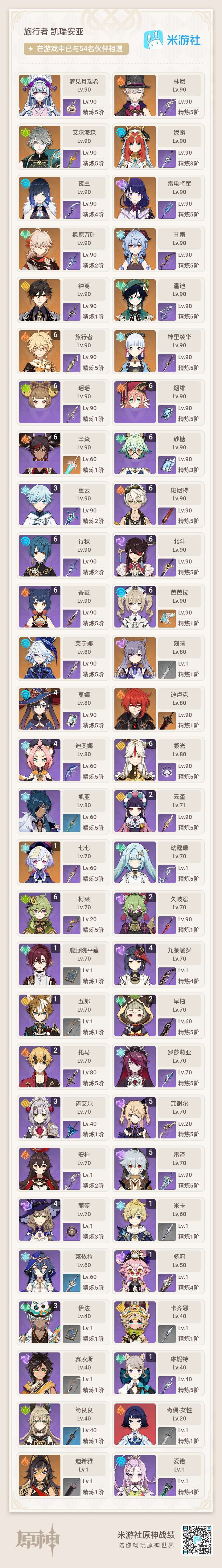 有满命,香菱,行秋,班尼特。有甘雨,枫原万叶,雷神,水神,风神,岩神等五星角色。