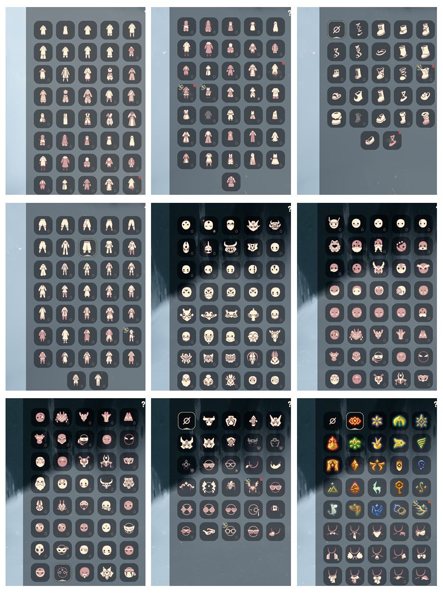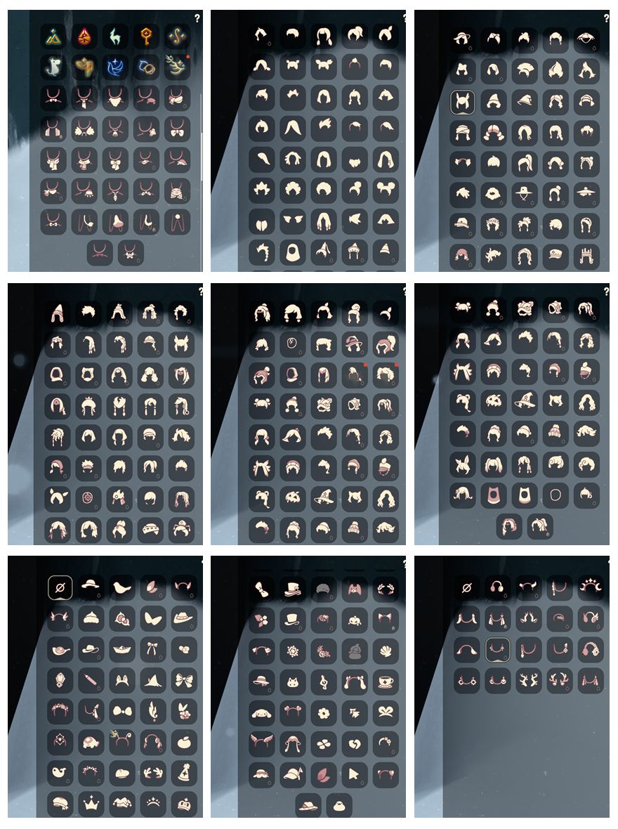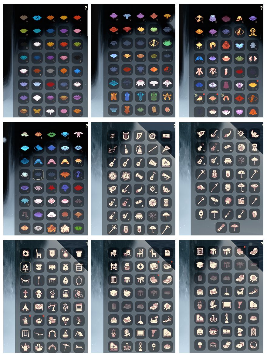 奔离远行服,致爱打扮,瑞气服饰,龙鳞束身长袍,园丁装扮,彩虹武士裤,披肩外袍,女巫裙,牛仔裤,向日葵连衣裙,兔子拖鞋,圣诞雪人,夏日拖鞋,跃动跑鞋,皮皮猫礼包,吸蟹面具,星月头冠,神鹿祝福礼包,彩虹耳饰,彩虹耳机,火焰眼镜,爱心眼镜,圣诞鹿角,巫树犄角,大蝴蝶结,水母肩饰,夏日有友礼包,奔离远行发,温暖绒帽,海蓝波浪发型,彩虹帽,巫师帽,蜘蛛朋克头,大耳狗装扮,贝壳发饰,雪花发夹,玉兔发饰,小狗周年头饰,迷你大耳狗发饰,四叶草头饰,蓝色乐会,TGC斗篷黑,创始人斗篷,小王子围巾,星球夹克,欧若拉之翼,奉献斗篷,异彩莲花斗篷,鲤跃龙门,盘龙围巾斗篷,海龟斗篷,周年线框斗篷,蝙蝠斗,蛛网斗篷,透明蜘蛛斗,吸蟹斗篷,暖冬瑞雪,白雪斗篷,雪怪斗篷,暖冬夹棉斗篷,浪漫流星斗篷,大耳狗服饰,文雀礼包,飞蛾礼包,风之旅人礼包,绊爱礼包,粽叶斗篷,雏鸟之琴,音韵吉他,凯旋手碟,惊喜手杖,欧若拉之声,中秋灯笼,瑞气纸伞,夏日阳伞,小提琴,荷叶伞,飞鸟纸伞,情人秋千,情人跷跷板,花憩茶桌,小憩茶桌,野餐礼包,网云留声机,狐狸背包,情人小船,彩色泡泡机,冥龙南瓜,猫咪背饰,篝火点心,雪花水晶球,球赛礼包