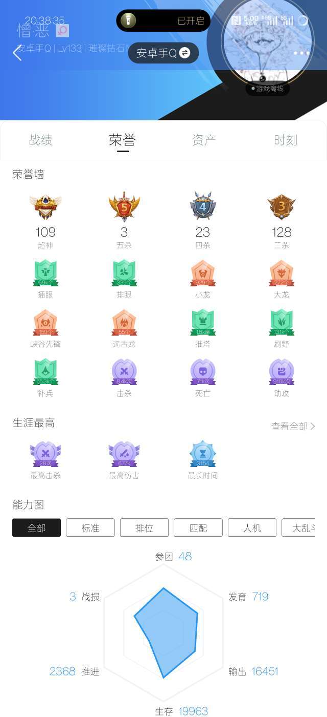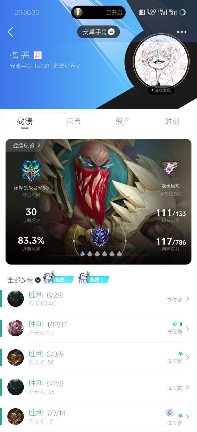皮肤117 英雄111 段位钻五 信誉分5 传说皮肤15 请游戏局内保持文明,防止禁言影响他人游戏,祝您玩得愉快!