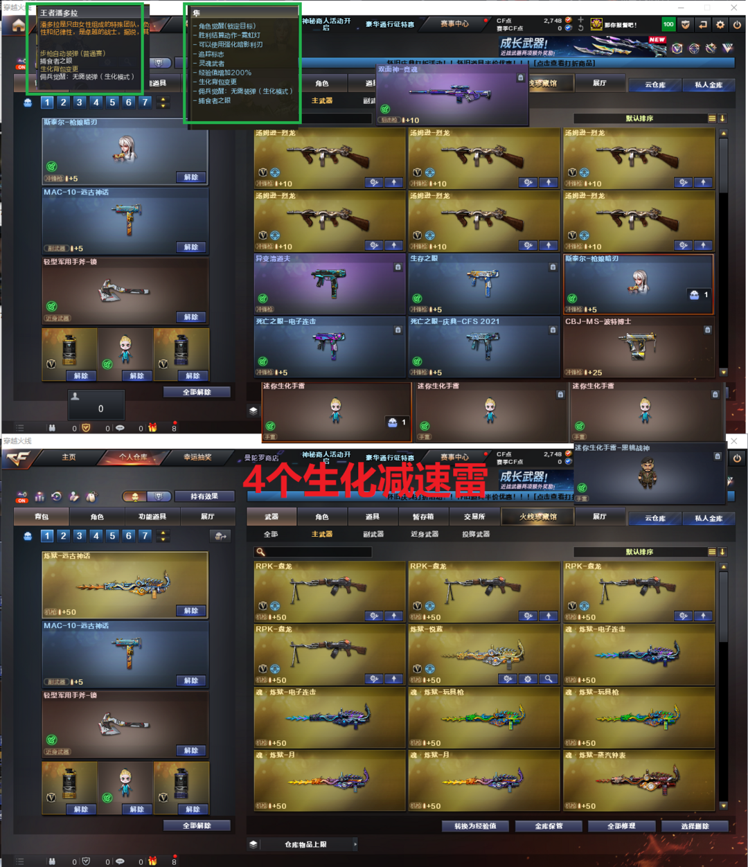 排位:可以--------------生化四防全装(可以变更生化背包、查看僵尸血量):无需换弹、6烈龙、4盘龙、炼狱、斯太尔枪娘暗刃 、异变清道夫、MAC-涂鸦、手斧镜、4个生化减速雷、超级对讲机、全部弹匣、、、、、爆破全装:幻神、USP手枪、柯尔特手枪、QBZ金色蔷薇、QBZ天罚、玄武、VSK-94-金蚀、、、天罚音效、、、生化四防(隼、王者潘多拉)