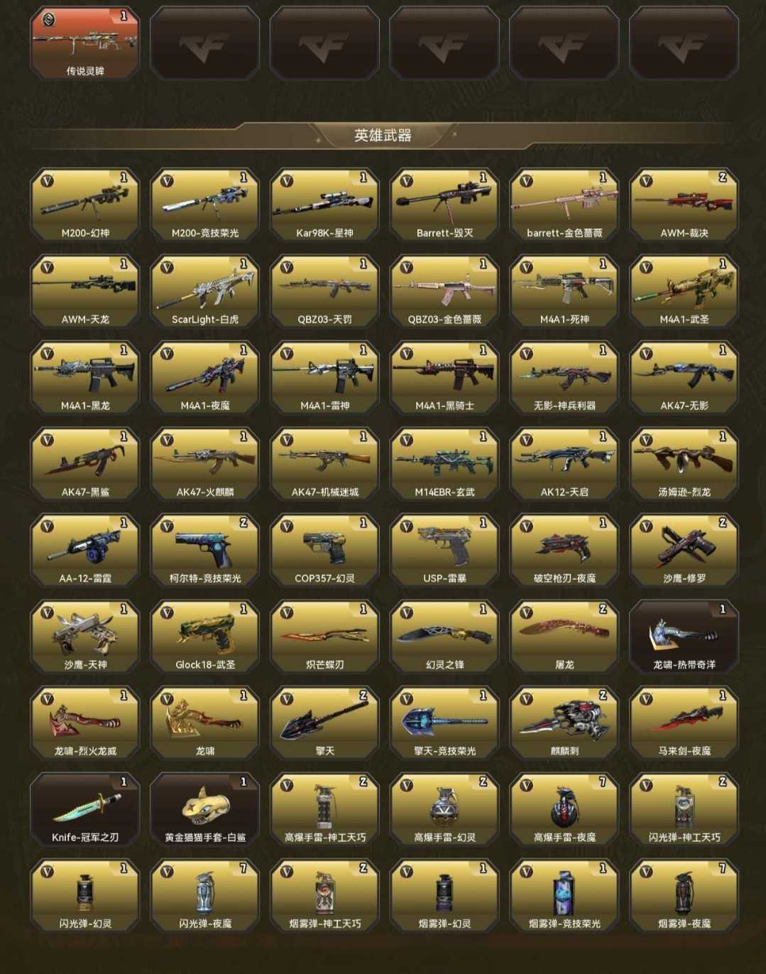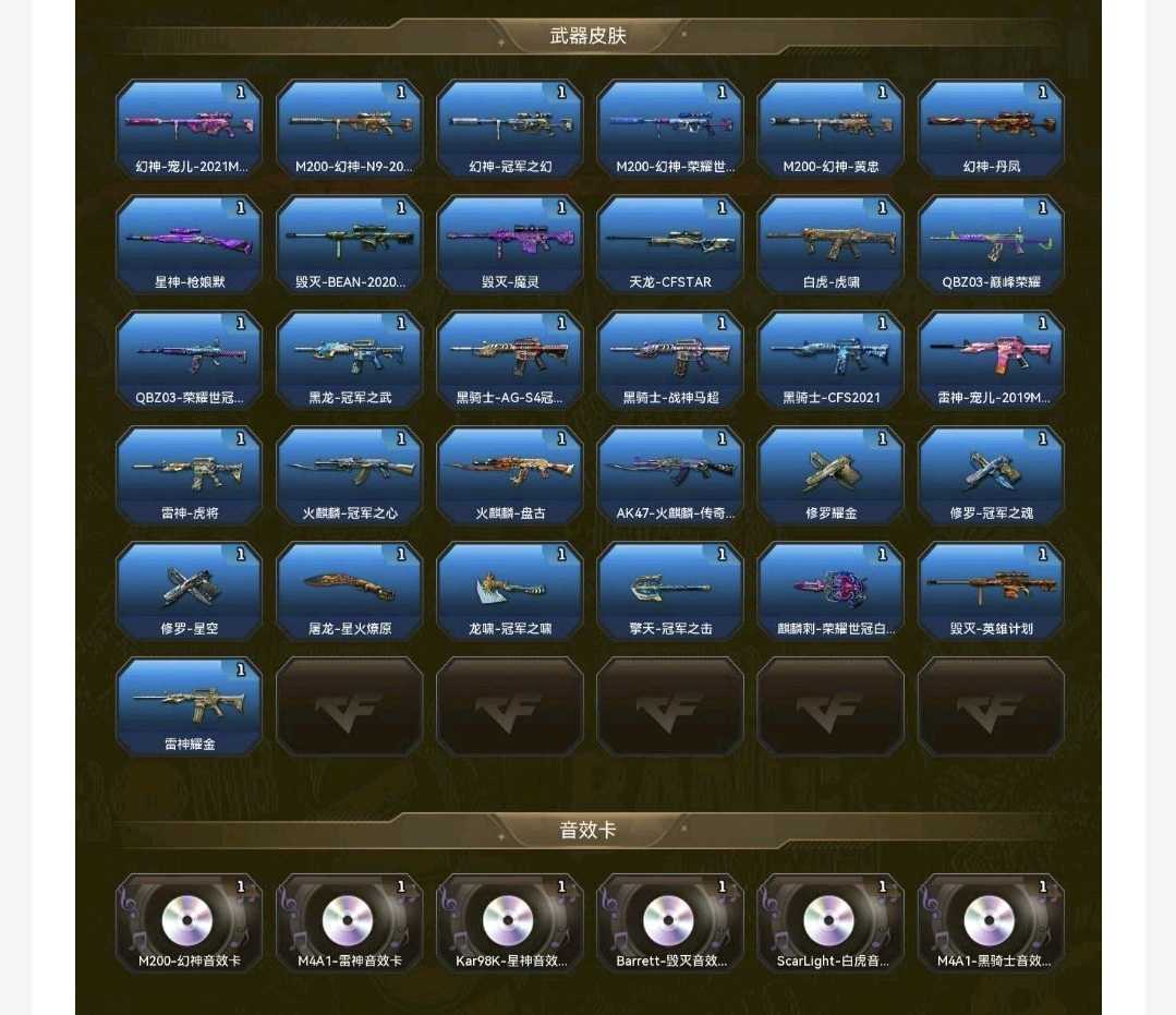 本游戏账号:英雄武器206个; 王者武器72个。 装备不多,但是主武器、副武器、近身武器够用 拥有完美游戏体验。重要的是,特殊装备有:M4A1-玫瑰精灵、麒麟刺、AK47-火麒麟、加特林-炼狱、龙啸-堕天神、HK417-朱雀、M200-幻神、王者火魄、传说梦魇、荣耀世冠-柯尔特、荣耀世冠-火麒麟、荣耀世冠-雷神、荣耀世冠-龙啸、黑骑士-海王、擎天-竞技荣光、烟雾弹-竞技荣光、闪光弹-竞技荣光、炫金黑龙、炫金雷神、炫金毁灭、炫金武士、炫金骑士、火麒麟-暗月、王者之魄高爆手雷、王者之魄闪光弹、王者之魄烟雾弹、源·火麒麟、王者玉锋、高爆手雷-雷霆王者、炼狱-悦蓝-觉醒版、王者之势-觉醒版、王者之幻-觉醒版、王者之心-觉醒版、王者之怒-觉醒版、王者之武-觉醒版、王者之翼-觉醒版、王者之锋-觉醒版、王者之魄-觉醒版、王者幻神-觉醒版、王者白虎-觉醒版、堕天使、王者之瞳、迷迭香、炽天使、王者-葵-貂蝉、王者玲珑、职业选手、等,随意畅选。