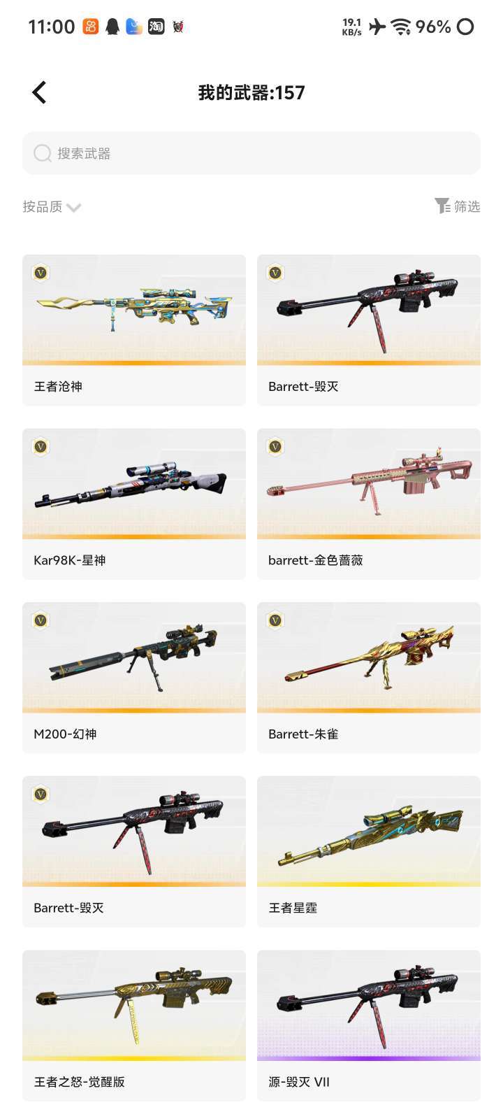 装备齐全拥有完美游戏体验。AN94-超新星、M4A1-黑骑士、AK47-黑武士、AK47-火麒麟、Barrett-毁灭、加特林-炼狱、M4A1-雷神、M4A1-黑龙、QBZ03-金色蔷薇、AA-12-雷霆、Scar Light-白虎、Kar98K-星神、Barrett-朱雀、M200-幻神、荣耀世冠-火麒麟、荣耀世冠-龙啸、黑骑士-海王、擎天-竞技荣光、柯尔特-竞技荣光、M4A1-神工天巧、USP-神工天巧、唐刀-神工天巧、王者星霆、王者-瞳-闭月羞花、王者涂鸦、王者潘多拉、Barrett-毁灭音效卡、M4A1-黑骑士音效卡、Scar Light-白虎音效卡、等,随意畅选。