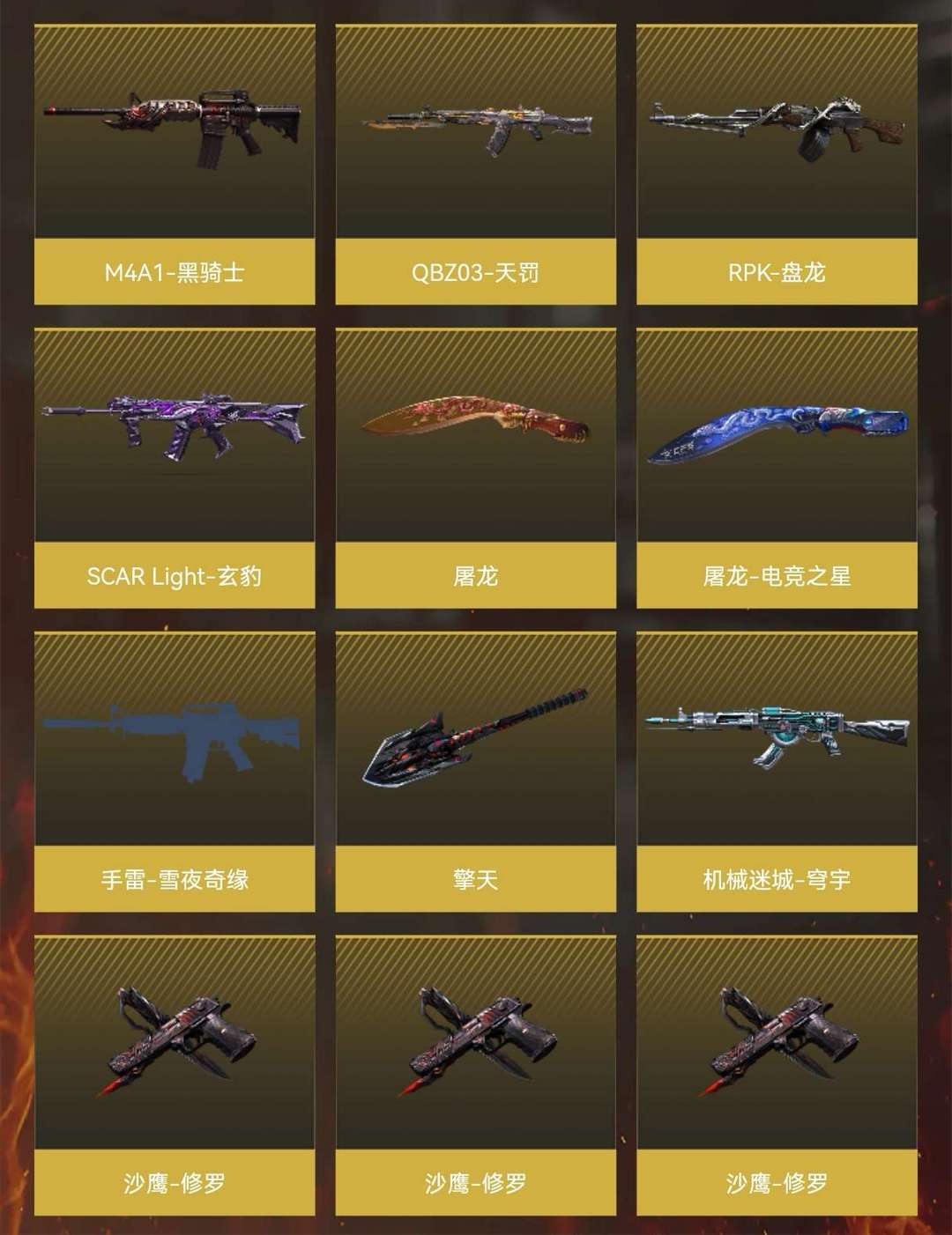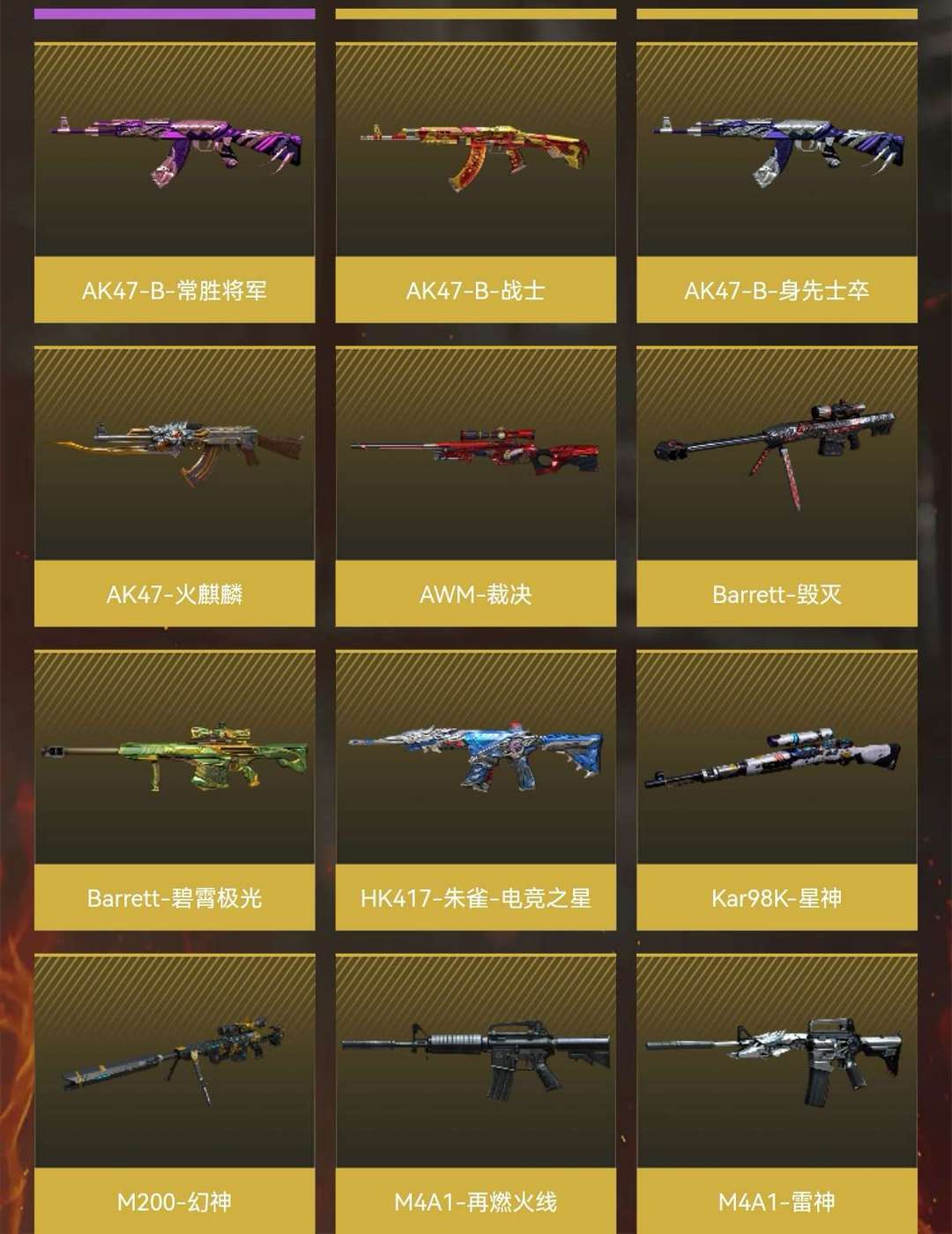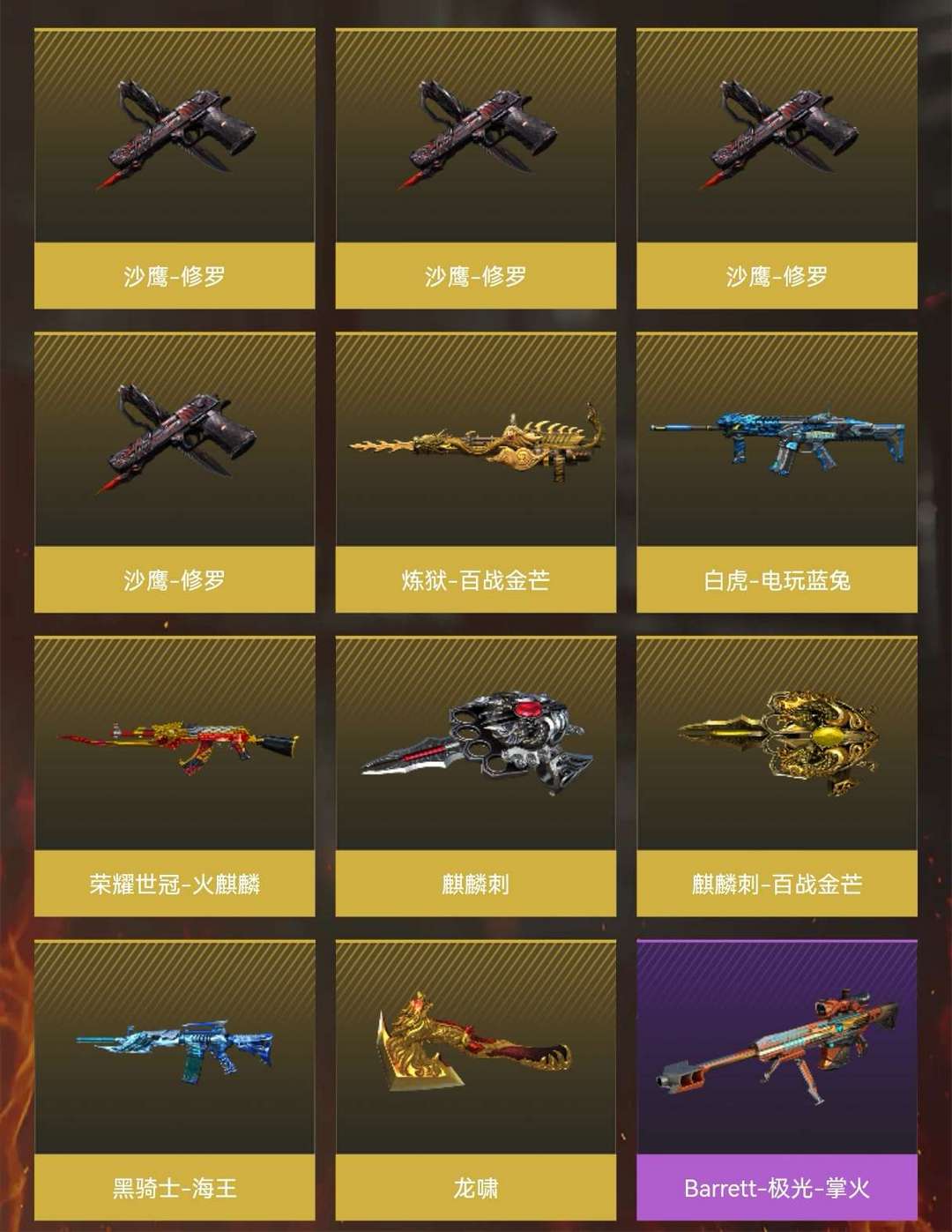 本游戏账号:特殊装备有:M4A1-黑骑士、麒麟刺、AK47-火麒麟、Barrett-毁灭、加特林-炼狱、M4A1-雷神、M4A1-青龙、Kar98K-星神、Barrett-朱雀、M200-幻神、黑骑士-海王、M14EBR-玄武、炫金武士、炫金毁灭、王者之势、炫金骑士、王者炎心、王者玉锋、高爆手雷-雷霆王者、源·火麒麟、堕天使、王者-葵-貂蝉、圣诞潘多拉-X、Barrett-毁灭音效卡、AK47-火麒麟音效卡、M4A1-黑骑士音效卡、M200-幻神音效卡、等,随意畅选。