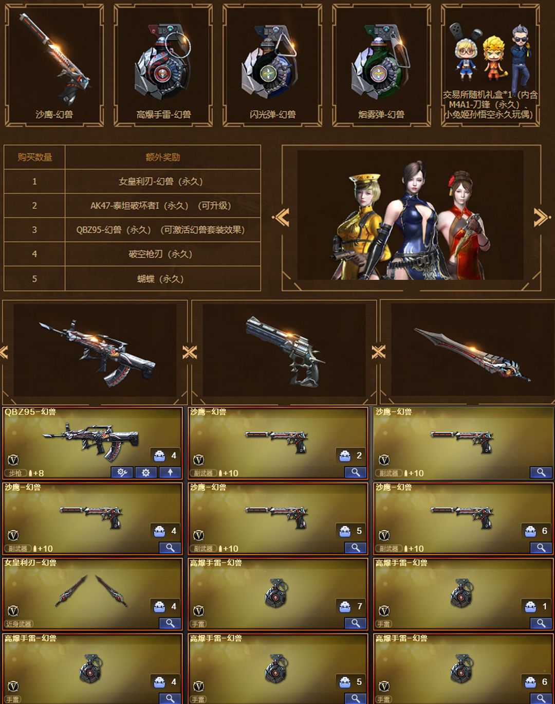 【装备道具】:可排位★蝴蝶★绝版幻兽套★十周年幻兽年套★王者复仇★王者之心★王者之怒★炼狱悦蓝★破空枪刃★qbz金色蔷薇★赛事荣耀皮肤★雷神荣耀之魄★毁灭荣耀之怒★屠龙-荣耀之锋★沙鹰幻兽★神罚 激光毁灭者★死亡之眼★6烈龙炼狱★变异宝贝死亡对讲机不退包★佣兵觉醒无需换弹手斧镜减速雷★捕食者之眼查看血量★