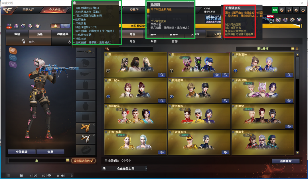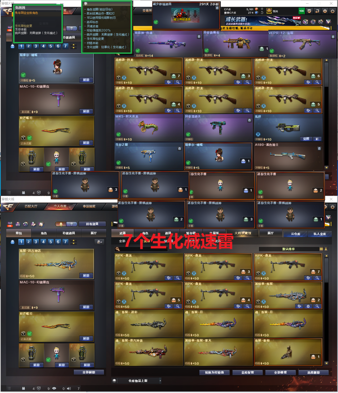 排位:可以、、、、、、、、生化四防:(可以变更背包、查看生化僵尸血量):无需换弹、6烈龙、5盘龙、炼狱、斯太尔蝴蝶、VPER-12-宙斯、MK5-炽火炎龙、异变镇魔者、异变清道夫、双面神、死亡之眼、MAC涂鸦、炽芒蝶刃、手斧镜、7个生化减速雷、超级对讲机、减少停顿道具、全部弹匣、、、、、、、、爆破四防:幻神2皮(EP荣耀、电流骇客)、王者星神、、、、、传说破晓、USP雷暴、COP云龙、USP珊瑚、、、、白虎九尾狐、QBZ金色蔷薇、王者蔷薇、、、裁决音效、、、4套雷暴、1套云龙、1套雷暴王者、、、生化四防(隼、兔囡囡)、爆破四防(王者潘多拉、王者魅影)