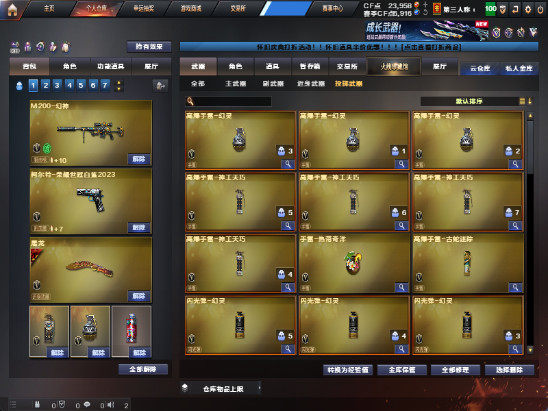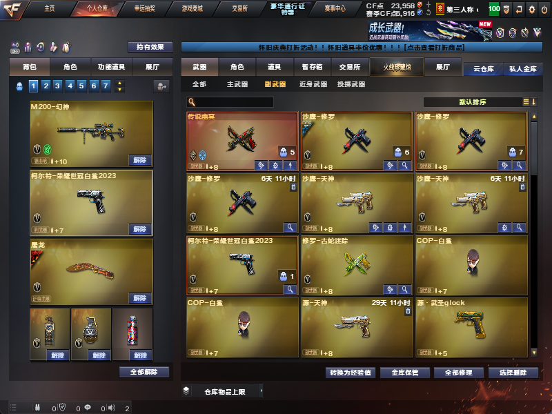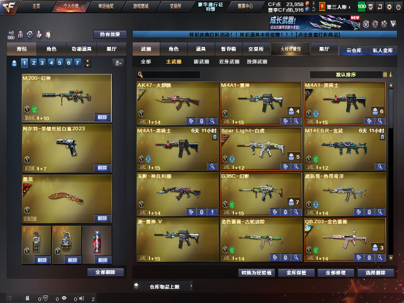 英雄武器:M14EBR-玄武;加特林-炼狱;Barrett-极光;沙鹰-修罗;屠龙;M4A1-黑骑士;Barrett-暗月传说;柯尔特-荣耀世冠白鲨2023;G36C-幻影;屠龙;传说幽冥;传说幽瞳;炽芒蝶刃;手雷-热带奇洋;龙啸-热带奇洋;超新星-热带奇洋;M4A1-黑骑士;AWM-裁决;黑武士-锦绣游龙;闪光弹-幻灵;烟雾弹-幻灵;高爆手雷-幻灵;龙啸-烈火龙威;闪光弹-神工天巧;高爆手雷-神工天巧;烟雾弹-神工天巧;无影-神兵利器;AK-47-猩红传说;白虎-电玩蓝兔;M200-幻神;QBZ03-金色蔷薇;Scar Light-白虎;沙鹰-修罗;M4A1-雷神;Barrett-毁灭;AK47-火麒麟;擎天;沙鹰-天神;麒麟刺;龙啸
