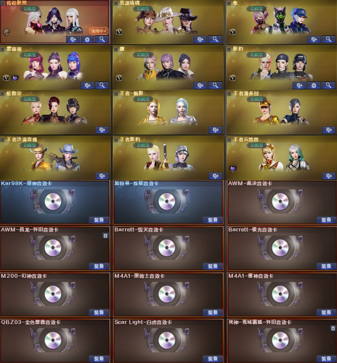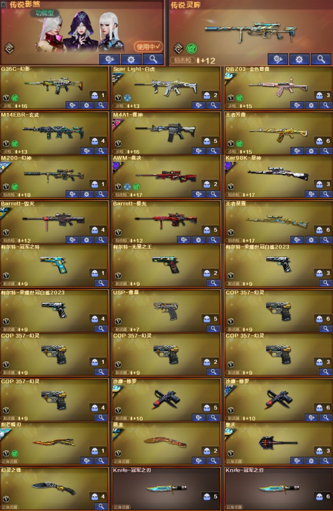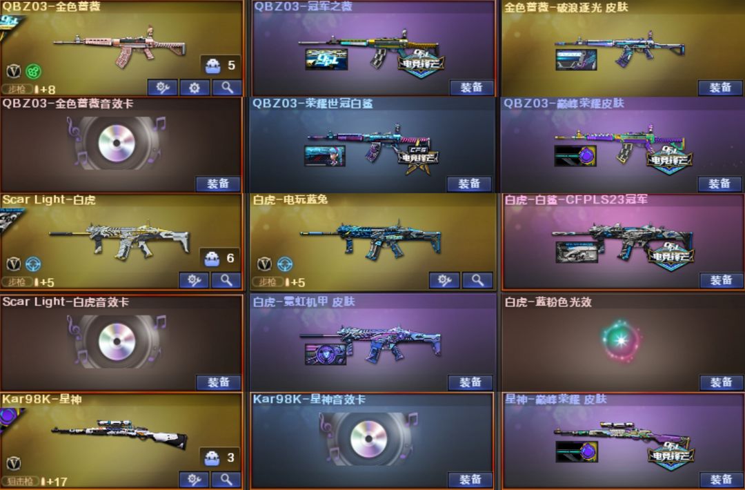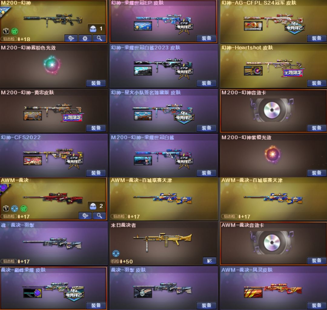 【传说影煞-灵眸】【幻神-EP-AGS24-白鲨2023-Heartshot-星火小队-白鲨2022-CFS2022-黄忠-幻神音效卡】【星神-巅峰荣耀-星神音效卡】【裁决-裁决音效卡-巅峰荣耀-羽掣-凤灵】【白虎-白鲨-霓虹机甲-白虎音效卡】【QBZ03-冠军之薇-破浪逐光-白鲨-巅峰荣耀-金色蔷薇音效卡】【王者芳薇】【G36C-幻影】【M14EBR-玄武】【柯尔特-白鲨*2】【USP-雷暴】【柯尔特-冠军之特】【柯尔特-无冕之王】【COP 357-幻灵*5】【炽芒蝶刃】【炽芒蝶刃-白鲨-冠军炽芒】【冠军之刃*2】【荒漠琉璃-王者潘多拉-王者沙漠玫瑰-王者影豹-王者云悠悠-雾萌萌-鹰-影豹-月兔特工-隼】【毁灭-荣耀之怒-毁灭音效卡】