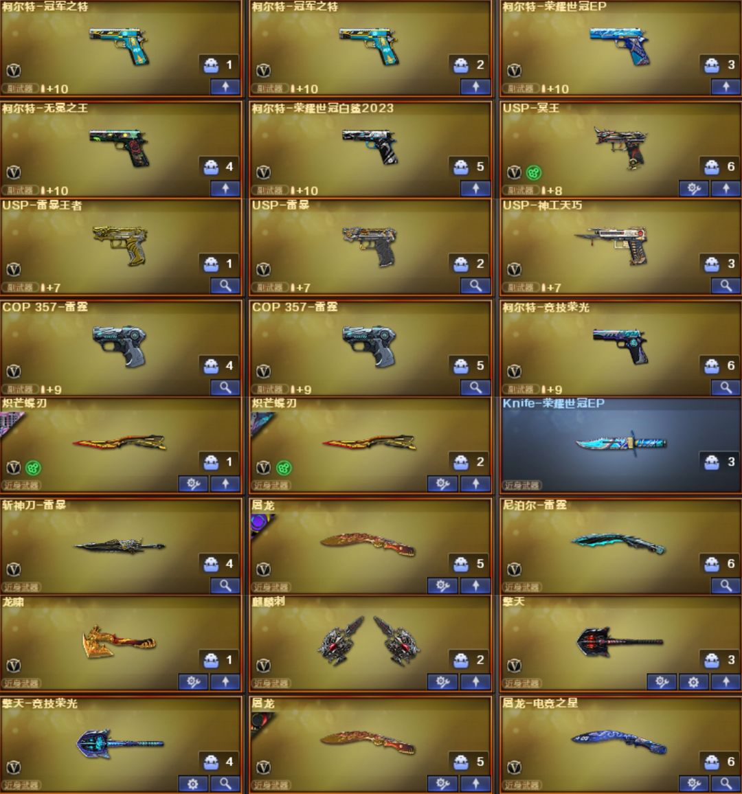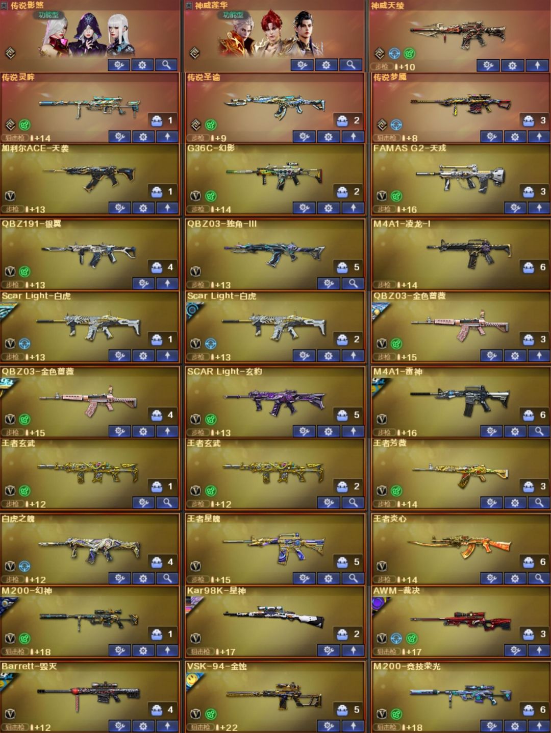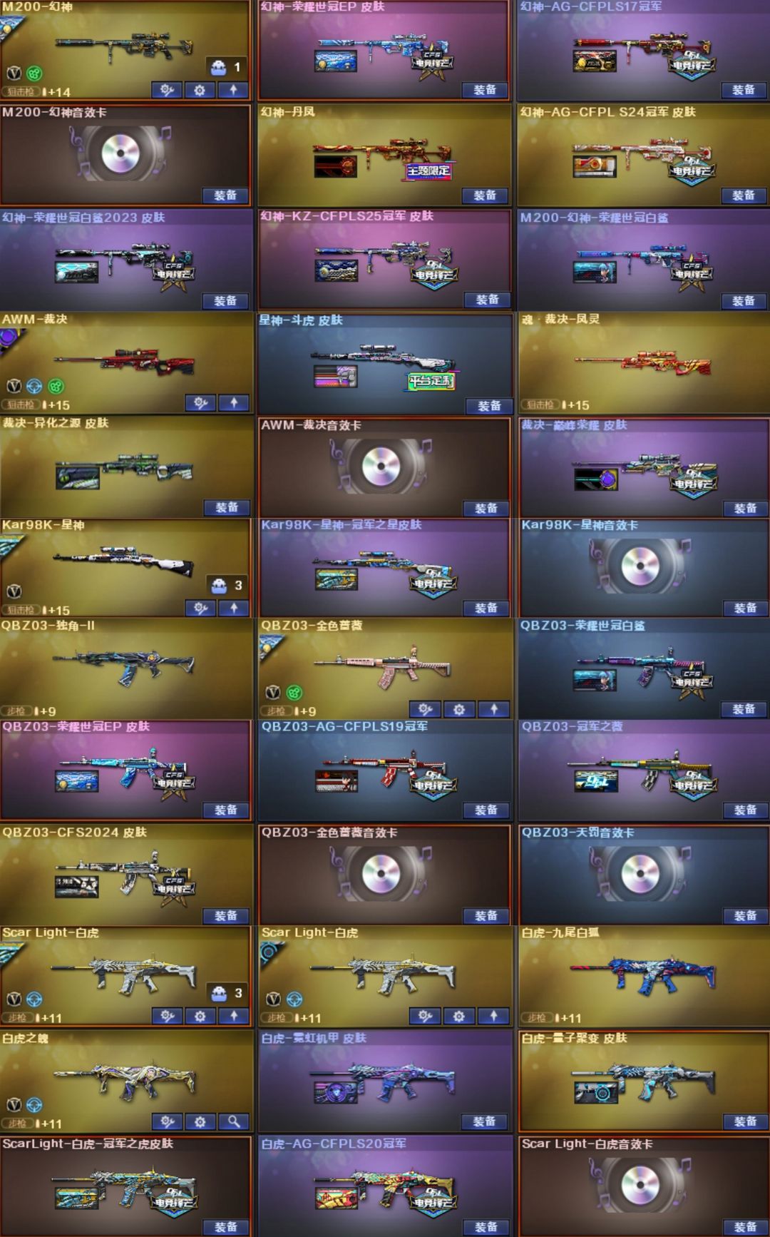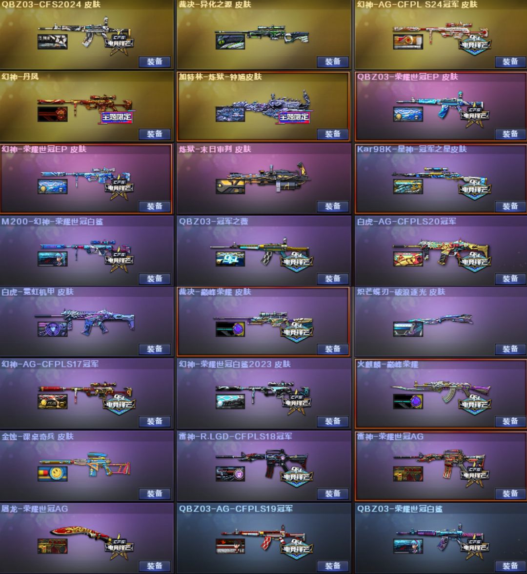 【6烈龙-毒蜂-斯泰尔-蝴蝶-盘龙-炼狱-泡泡象-传说影煞-圣谕-灵眸-梦魇】【幻神-KZ-EP-AGS24-白鲨2023-白鲨-AGS17-丹凤-幻神音效卡】【星神-斗虎-冠军之星-星神音效卡】【裁决音效卡-巅峰荣耀-异化之源】【白虎-音效卡-冠军-量子-AG-霓虹】【白虎之魄】【QBZ03-EP-冠军之薇-白鲨-AG冠军-CFS2024-金色蔷薇音效卡】【天袭-天戎】【王者芳薇】【玄豹】【幻影-天袭-天戎-银翼】【王者玄武】【柯尔特-白鲨】【USP-雷暴】【USP-冥王】【柯尔特-冠军之特*2】【柯尔特-EP】【柯尔特-无冕之王】【柯尔特-竞技荣光】【COP-雷霆*2】【炽芒蝶刃-白鲨-破浪逐光】【玄豹-毒蝰术士-关小雨-王者潘多拉-新海豹突击队】