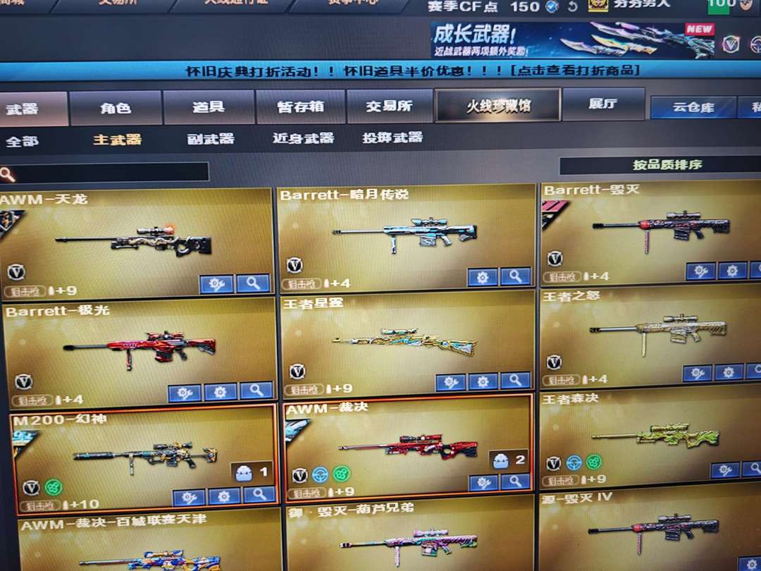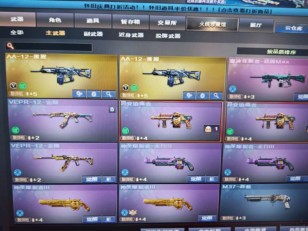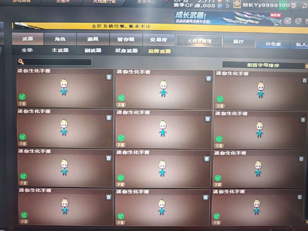 神威莲华,虹儿,宙斯,双镇魔,四蝴蝶刀,金色狮子,海神,双清道夫蝴蝶,八面玲珑,九霄圣角等。7个黑桃生化手雷。生化爆破全装,冠军之幻,冠军之特,G36c--幻影,加利尔--天袭,QBZ03金色蔷薇冠军等主流武器