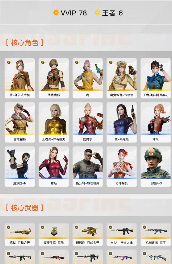 毁号,涉及毁坏虚拟财产罪及计算机安全罪,请文明游戏素质游戏,让我们共建美好租号平台 本游戏账号:英雄武器31个 王者武器3个。 可以玩爆破号、生化号、双全装、稀有武器、等模式。装备不多,但是主武器、副武器、近身武器够用 拥有完美游戏体验。重要的是特殊装备有:M200-竞技荣光、烟雾弹-竞技荣光、闪光弹-竞技荣光、USP-雷暴、柯尔特-竞技荣光、AK47-火麒麟、麒麟刺、擎天-竞技荣光、王者之翼-觉醒版、炫金黑龙、堕天使、王者之心金色光效、等,随意畅选。 注意事项: A.游戏过程中请不要恶意挂机或者不文明发言 B.恶意挂机、顶号等行为将被拉黑无法再次下单 C.进入游戏后中途请勿退出登陆,否则无法再次上号 D.部分账号由于异地登录可能会出现密码错误提示,通常再尝试5-6次后可上号 喜欢本账号请点 ☆收藏☆ 方便下次租用,谢谢光临惠顾