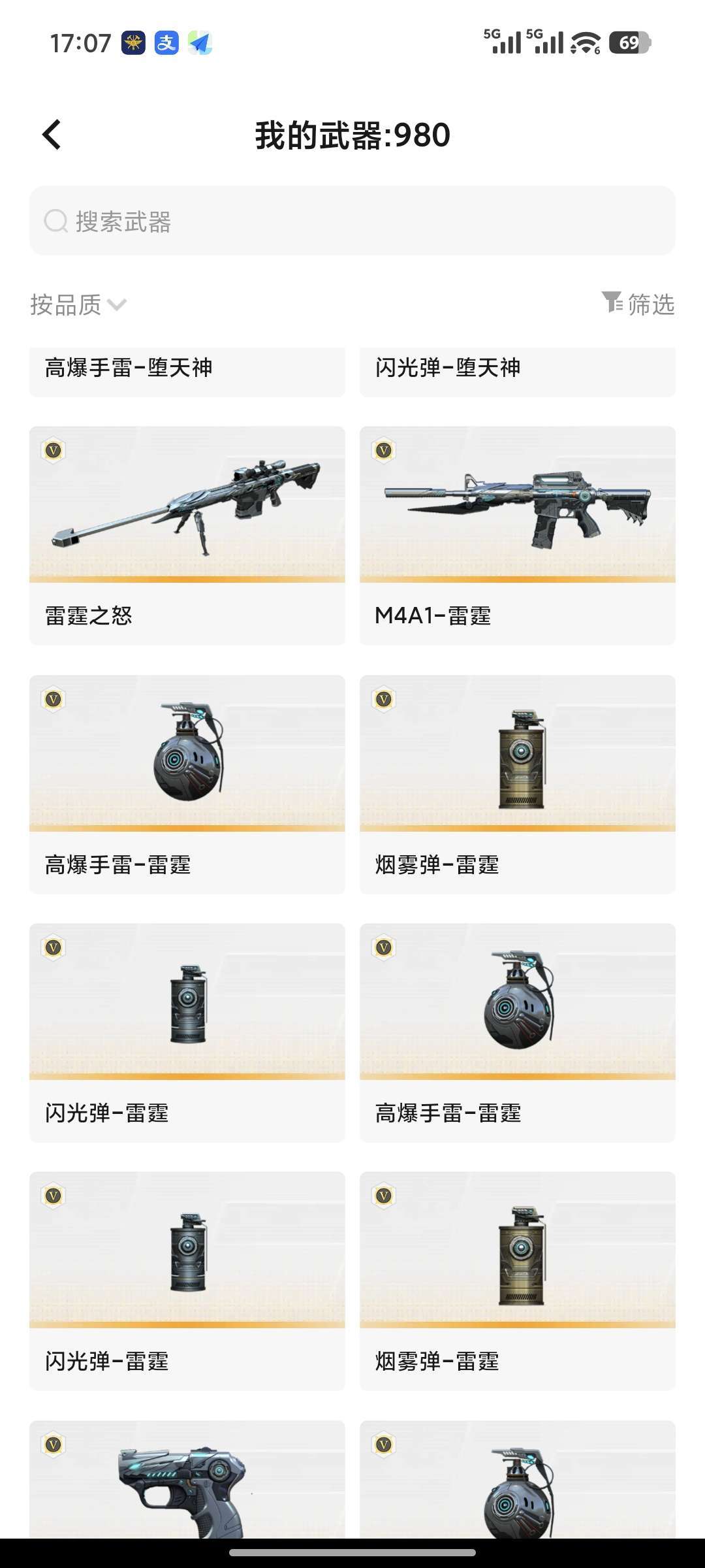王者级:迷迭香、炫、 王者觉醒系列(永久): 王者凰鸣-觉醒版、王者之怒-觉醒版、王者之魄-觉醒版、王者之戮-觉醒版 套装武器: 雷霆套装:AA-12-雷霆、烟雾弹/闪光弹/高爆手雷-雷霆、雷霆之锋、雷霆之契 夜魔套装 堕天神套装