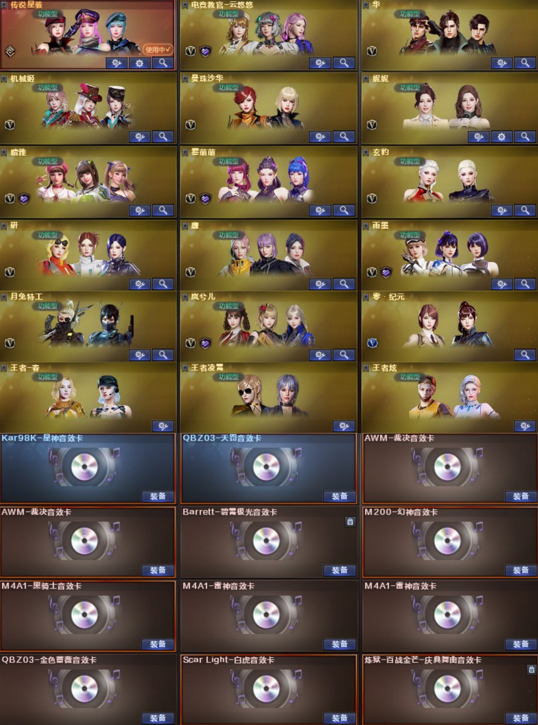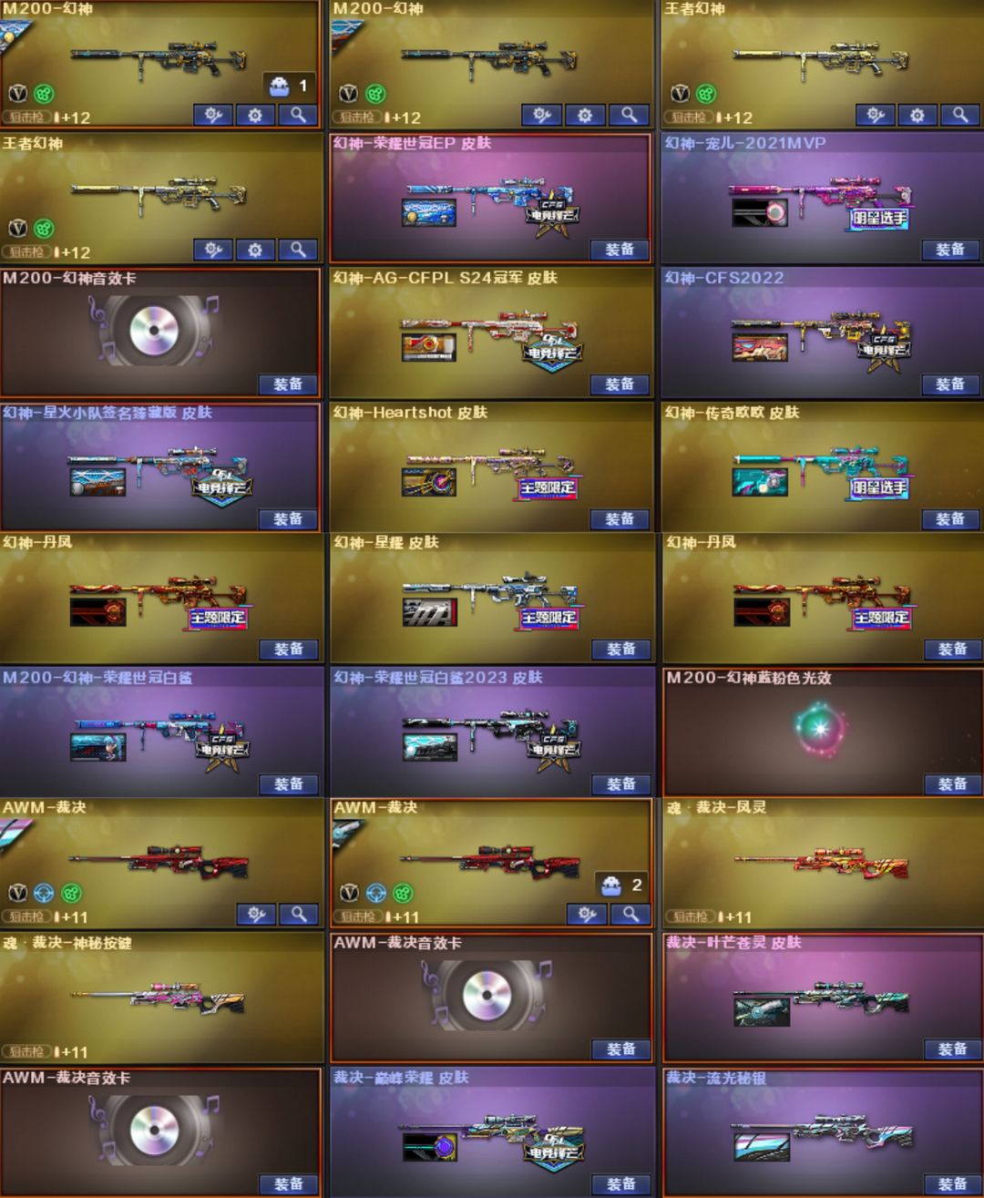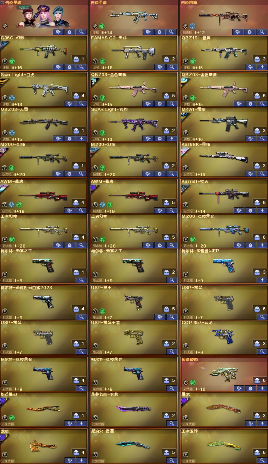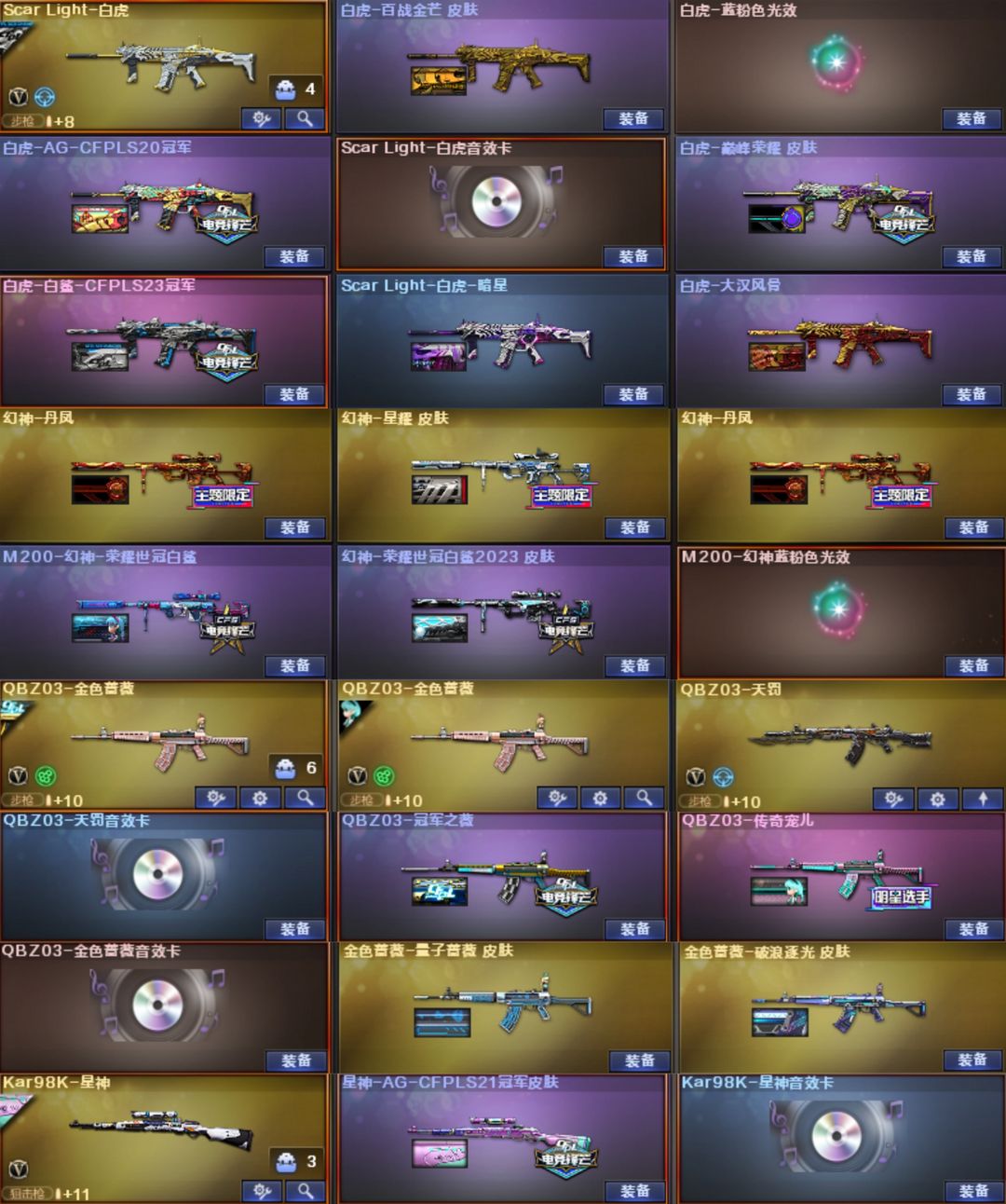 【玄豹7套】【传说星骇-圣谕-幽瞳-破晓】【幻神-电竞之星-EP-星火小队-传奇欧欧-宠儿-AGS24-白鲨2023-女团-CFS2022-白鲨2022-星耀-丹凤*2-幻神音效卡】【星神-AG冠军-星神音效卡】【裁决-裁决音效卡-巅峰荣耀-流光秘银-叶芒苍灵】【白虎-白鲨-百战金芒-AG冠军-巅峰荣耀-大汉风骨-暗星-白虎音效卡】【QBZ03-传奇宠儿-冠军之薇-量子蔷薇-破浪逐光-QBZ音效卡】【SCAR Light-玄豹】【天戎】【幻影-破浪逐光】【银翼】【EP柯尔特】【柯尔特-白鲨】【USP-雷暴*2】【USP-雷暴王者】【USP-冥王】【柯尔特-无冕之王*2】【柯尔特-竞技荣光*2】【COP云龙】【炽芒蝶刃-破浪逐光】【雷神荣耀三件套】【妮妮】