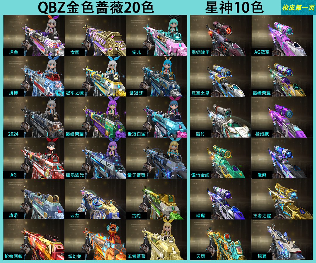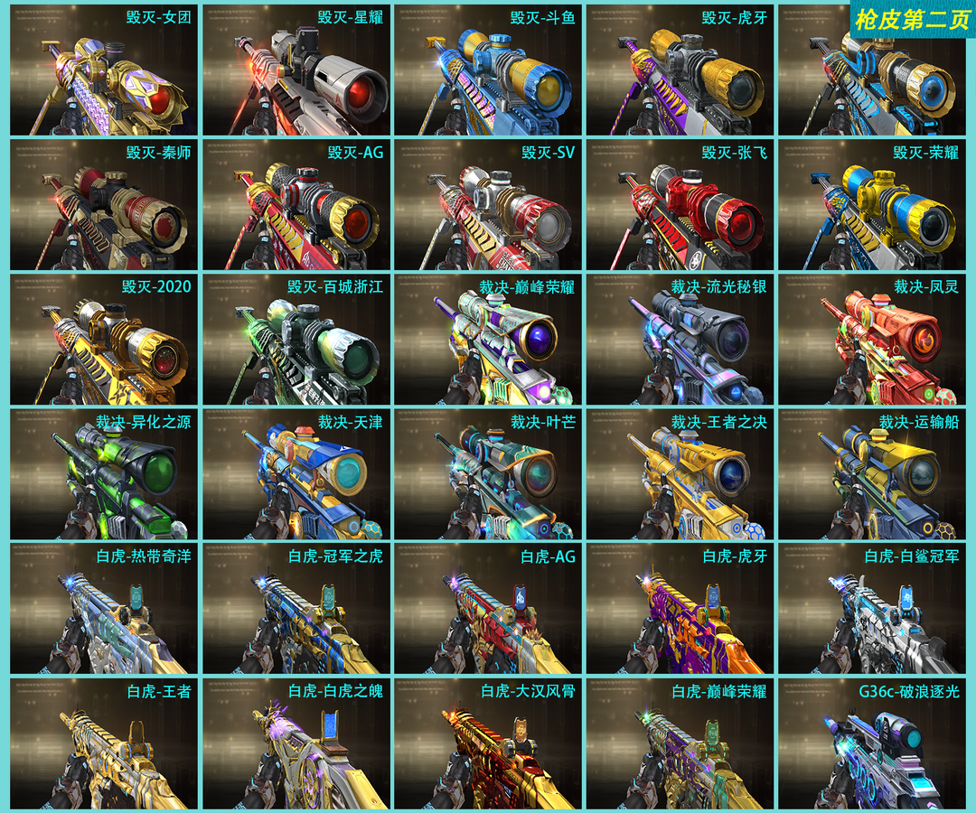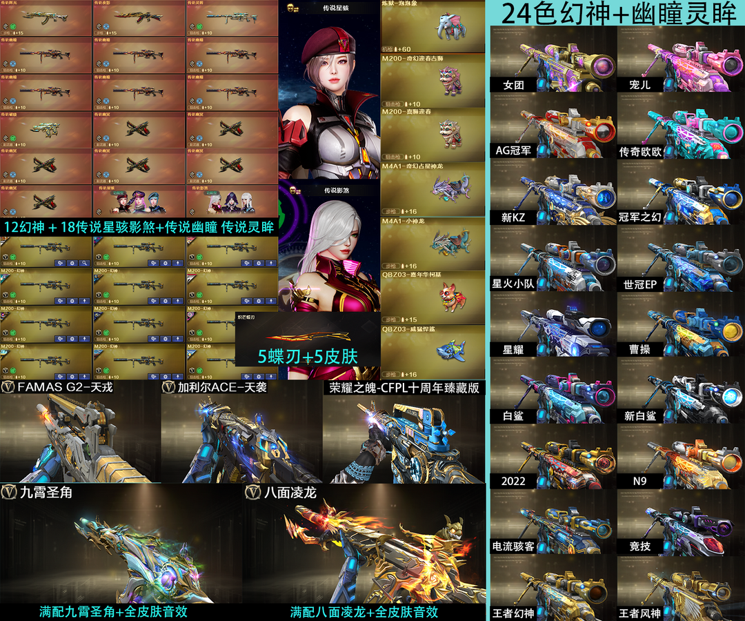 【传说星骇,传说影煞,传说辉光,传说夜影,传说灵眸,传说幽瞳,传说破晓,传说幽冥,八面凌龙,九霄圣角】炽芒蝶刃冠军炽芒,炽芒蝶刃破浪逐光,炽芒蝶刃荣耀世冠白鲨2023,雷神CFPL十周年臻藏,FAMASG2天戎,加利尔ACE天袭,G36C幻影,幻影破浪逐光,幻神奇幻迎春吉狮,幻神KZCFPLS25冠军,幻神荣耀世冠EP,幻神AGCFPLS24冠军,幻神荣耀世冠白鲨2023,幻神星耀,幻神传奇欧欧,幻神Heartshot,幻神星火小队签名臻藏版,幻神宠儿,幻神冠军之幻,王者风神,王者幻神,星神黯钢战甲,星神傲竹金蛇,星神巅峰荣耀,星神AG,星神冠军之星,星神破竹,白虎白鲨CFPLS23冠军,白虎巅峰荣耀,白虎虎牙,白虎AG,白虎冠军之虎,白虎大汉风骨,女团全套,QBZ03传奇宠儿,QBZ03荣耀世冠EP,QBZ03虎鱼,QBZ03冠军之薇,柯尔特冠军之特,柯尔特荣耀世冠EP,柯尔特荣耀世冠白鲨,柯尔特无冕之王,USP冥王,USP雷暴王者 ,COP357云龙,COP357雷霆王者,COP357堕天神。炼狱泡泡象,炼狱末日审判,炽火炎龙,VSK94金蚀。生化满配,挑战满配,爆破全装满配