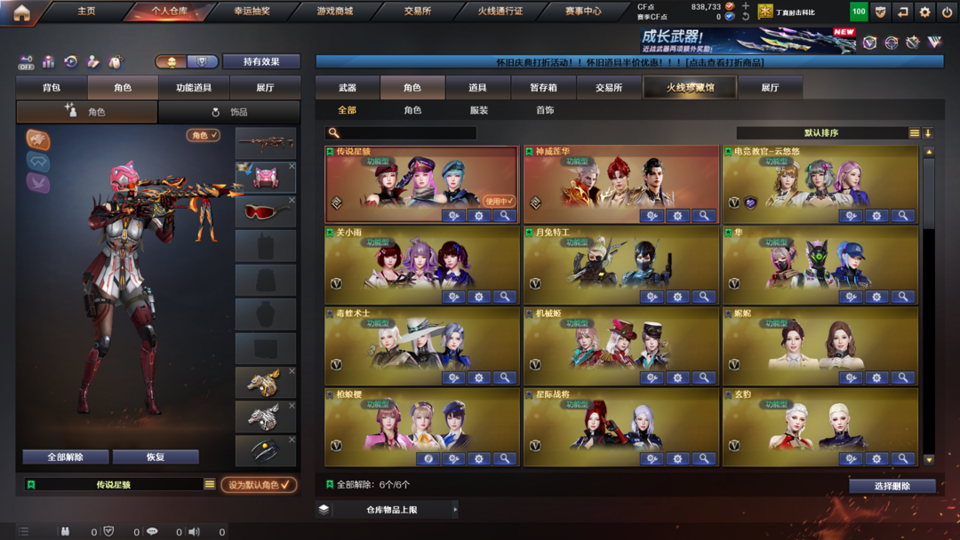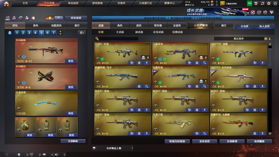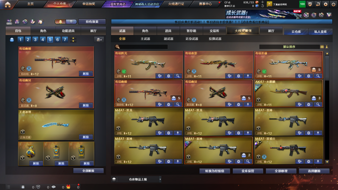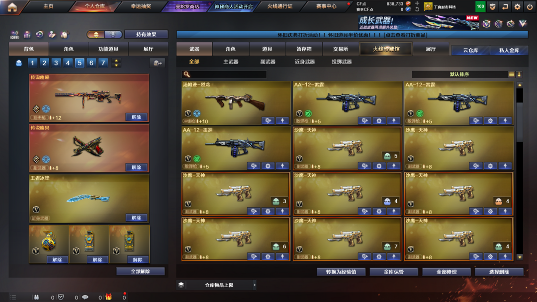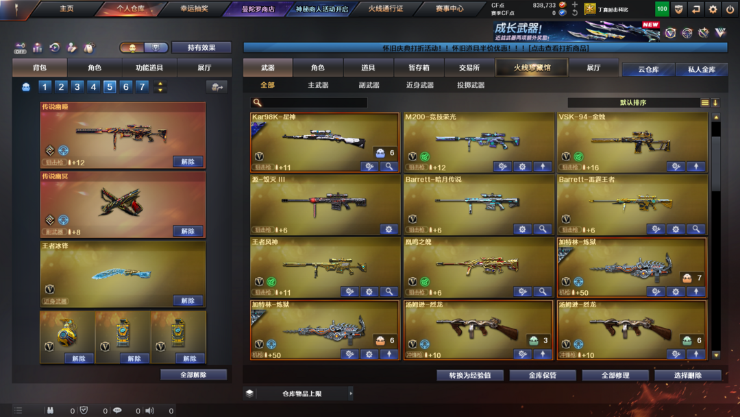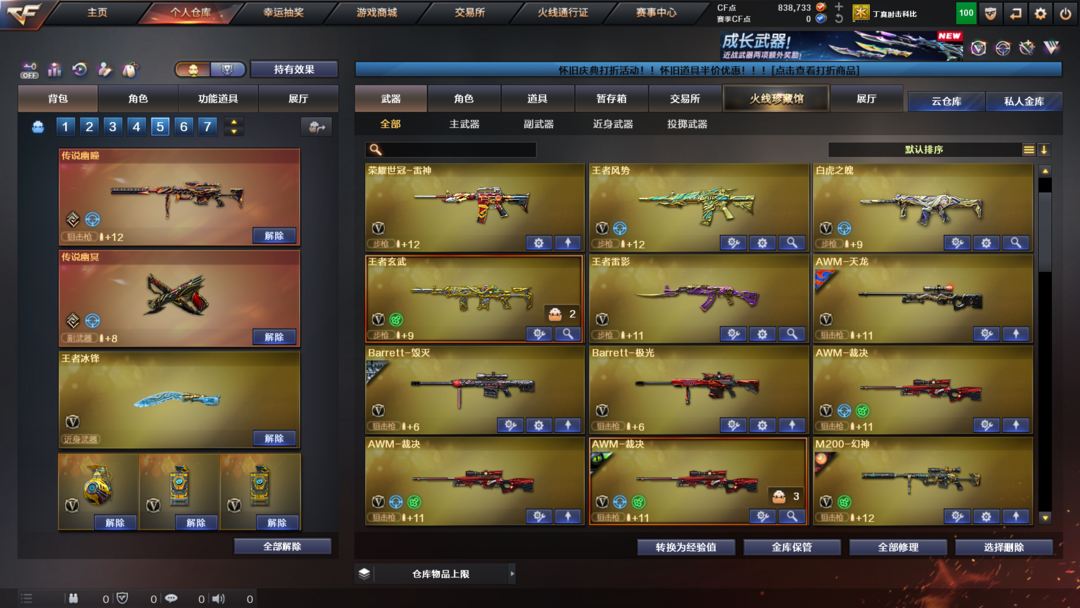 英雄武器:Anaconda-量子之心;炽芒蝶刃;Scar Light-白虎;M4A1-黑龙;九霄圣角;M4A1-雷神;丛林匕首-玄豹;AA-12-雷霆;传说圣谕;机械迷城-穹宇;雷霆之契;QBZ03-金色蔷薇;M200-幻神;G36C-幻影;传说辉光;屠龙;传说夜影;AK12-天启;Kar98K-星神;AK47-无影;Barrett-暗月传说;传说幽冥;沙鹰-天神;传说幽瞳;麒麟刺;加特林-炼狱;高爆手雷-竞技荣光;M200-竞技荣光;烟雾弹-竞技荣光;闪光弹-竞技荣光;柯尔特-竞技荣光;擎天-竞技荣光;M4A1-黑骑士;AK47-火麒麟;Barrett-毁灭;汤姆逊-烈龙;荣耀世冠-龙啸;AWM-天龙;擎天;Barrett-极光;AN94-超新星;荣耀世冠-火麒麟;荣耀世冠-雷神;M4A1-死神;AWM-裁决;八面凌龙;M4A1-猎神;QBZ03-天罚
