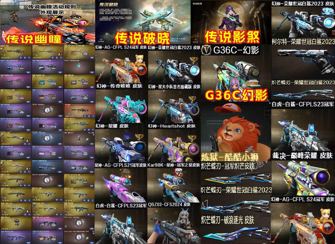 【装备道具】:幻神-Heartshot 皮肤/幻神-电流骇客 皮肤/幻神-星火小队签名臻藏版 皮肤/幻神-AG-CFPL S24冠军 皮肤/幻神-欧欧 皮肤/M200-幻神-荣耀世冠白鲨/幻神-荣耀世冠白鲨2023 皮肤/M200-幻神-N9-2022MVP/幻神-宠儿-2021MVP/幻神-巅峰荣耀/幻神-CFS2022/幻神-星耀 皮肤/星神-巅峰荣耀 皮肤/Kar98K-星神-冠军之星皮肤/Kar98K-星神-AG-CFPLS21冠军/星神璀璨皮肤★传说幽瞳/传说破晓★传说影煞★M200-竞技荣光/王者幻神★炽芒蝶刃-荣耀世冠白鲨2023 皮肤/炽芒蝶刃-冠军炽芒皮肤白虎-白鲨-CFPLS23冠军/白虎-霓虹机甲 皮肤/白虎-AG-CFPLS20冠军/QBZ03-CFS2024 皮肤/QBZ03-荣耀世冠白鲨/QBZ03-冠军之薇/裁决-流光秘银/裁决-巅峰荣耀/★电竞教官-云悠悠/月兔特工/_晴雅/隼/雨墨/研/华/王者影豹/王者岚兮儿/星神音效卡/幻神音效卡/裁决音效卡/黑骑士音效卡/金色蔷薇音效卡/白虎音效卡雷神音效卡/玄武音效卡/G36C-幻影/QBZ银翼