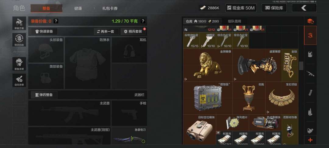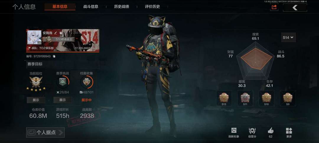 账号:60M 刀:急袭弯刀 螺丝刀 角色:新出的猫女 枪:伦琴Fal 少女前线h4 冰妹 有六格保险还剩20天 10.18
