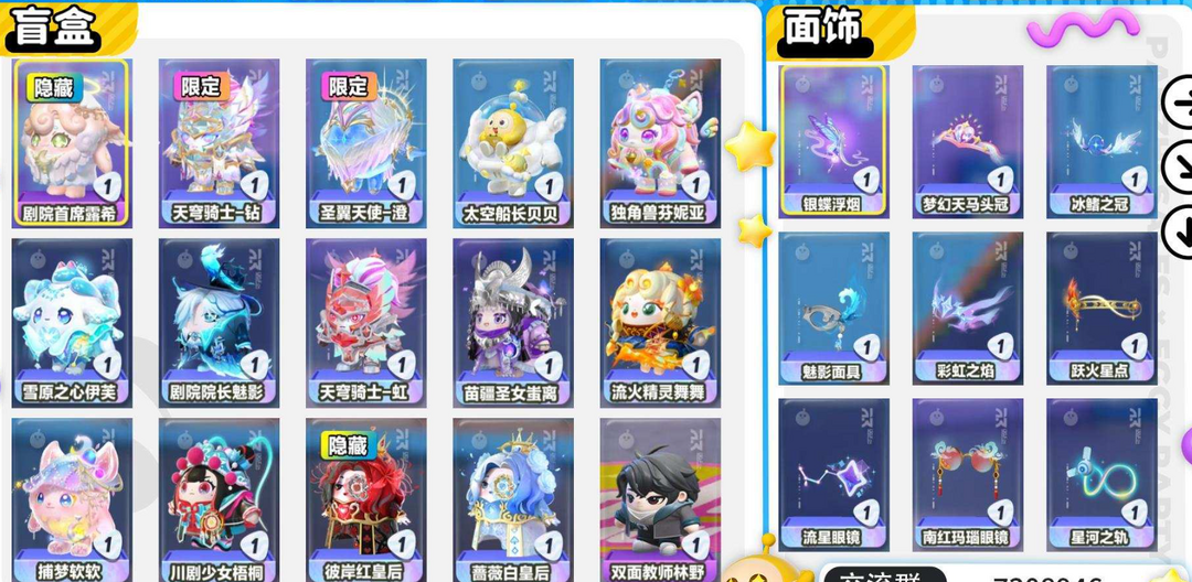 安卓官服◆15W潮流值◆17至臻角色盲盒◆100典藏角色盲盒◆至臻角色:天穹骑士-钻;圣翼天使-澄;独角兽芬妮亚;彼岸红皇后;天穹骑士-虹;剧院院长魅影;太空船长贝贝;雪原之心伊芙;川剧少女梧桐;流火精灵舞舞;蔷薇白皇后;苗疆圣女蚩离;捕梦软软;限定配饰:彩虹之焰;冰晶耀盾;裁决圣环;月白之隐;碎晶幻翼;闪闪星蝶翅膀;天照耀盾;稀有盲盒角色:萤火偷偷;灵灯闪闪;北极狐卢比;歌院首席露希;小羊;奥特曼;大耳狗;等各种