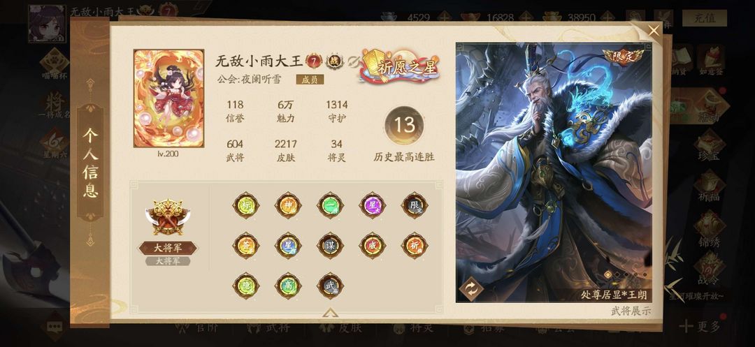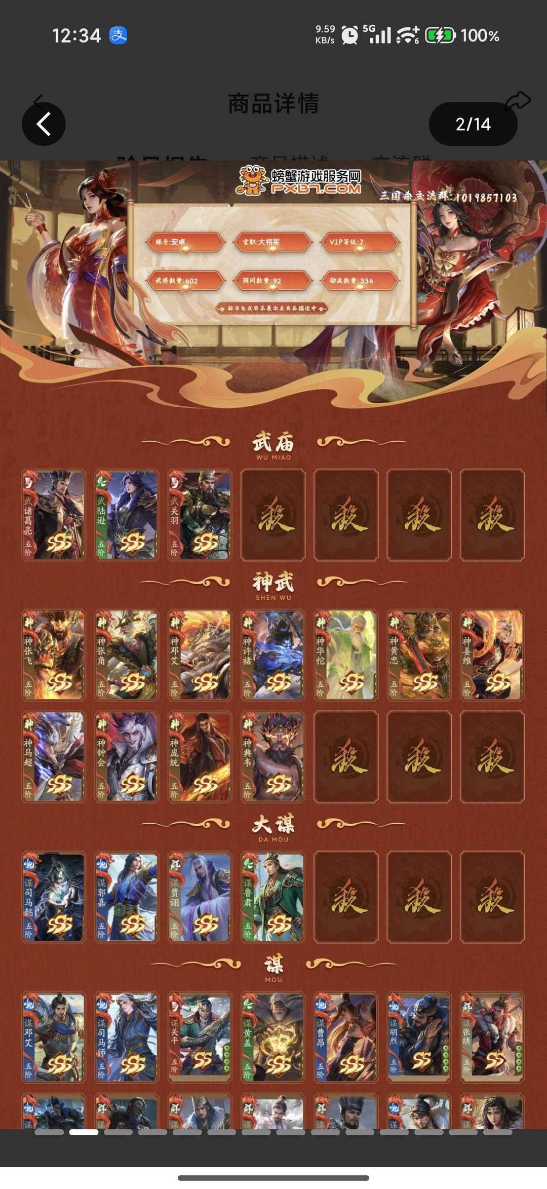 【星耀会员、高山灯刘徽、三武庙、威灯、神武灯、荟萃灯、隐玉灯、星河灯、祈福灯、乐灯】,官服个性号,40W帅点大将军,目前有604个武将,2217个皮肤,刘徽、三武庙,武诸葛,武陆逊,武关羽,10神武(全动),7威,新武将“谋吕蒙、威曹操、郭缇萦、徐纹、苏越”等已入手,武将仅差王朗、武皇甫嵩、谋周瑜陆逊荀彧姜维,其他各种限定皮肤都有。下架是说明在别的平台租出去了可以先收藏起来。