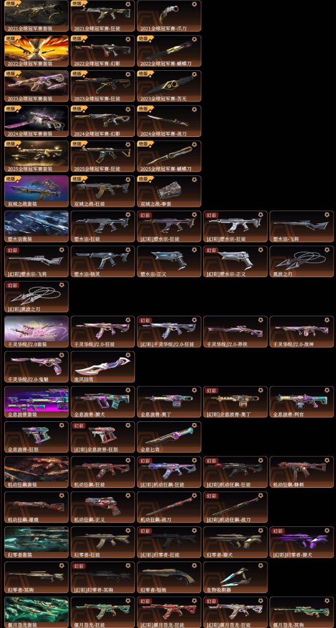 悲悯之刃千灵2.0套装2025冠军掠影2.0套装22冠军苍龙之刃离子狂徒VCT2025爪双城之战狂徒拳套全特效掠影狂徒2024全球冠军满特效2021全球冠军2023全球冠军*781协议套离火刃-双城之战正义*VCT多颜色*剥皮小刀归零者套装*机动狂飙*全息波普*塑水宗*偃月苍龙*堕天遗武套装*盖亚复仇套装*天界神兵套装*天界神兵2.0套装耀鳞威龙套装威龙之刃