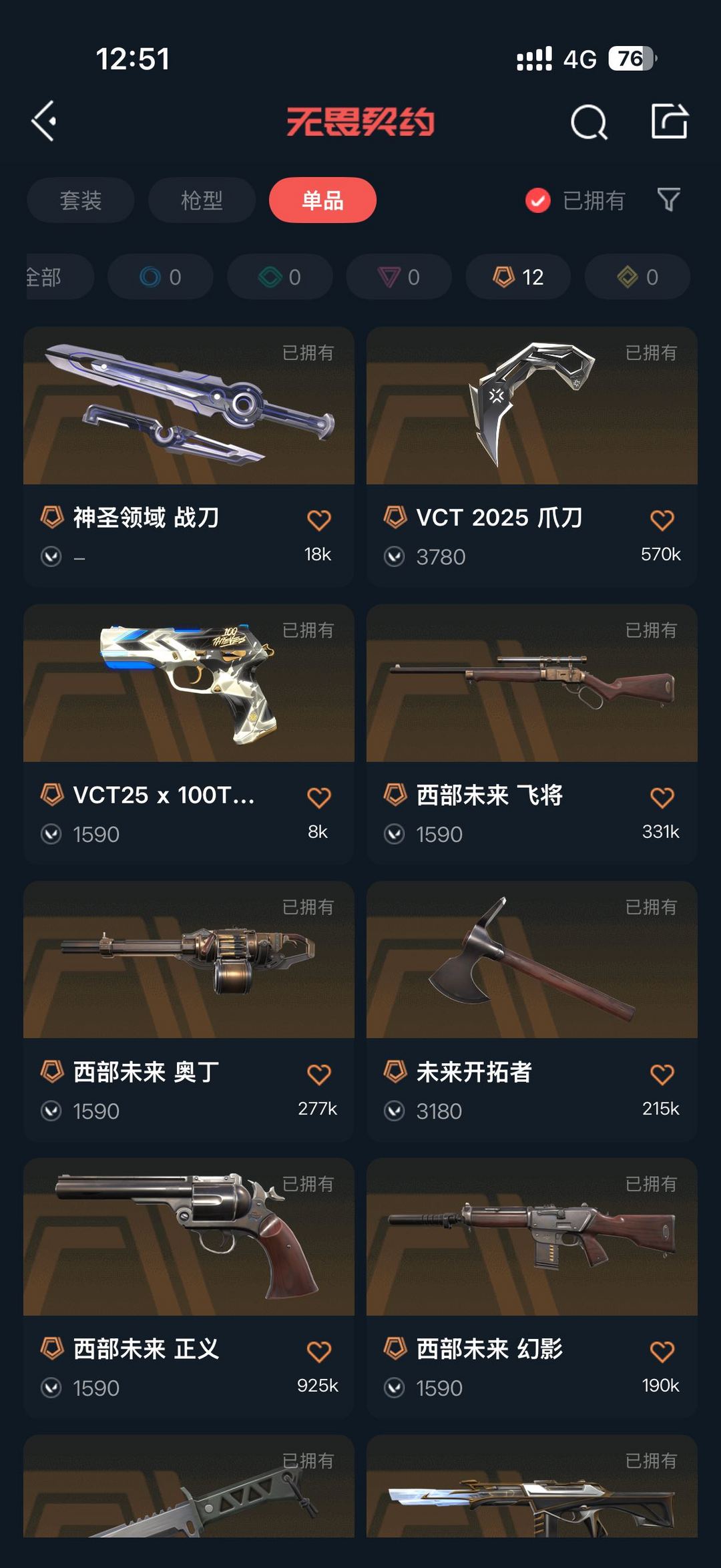 全英雄 vct爪刀,边陲套,紫金狂徒 归零者狂徒和大狙 光明哨兵幻影,剥皮小刀 vct2025标配