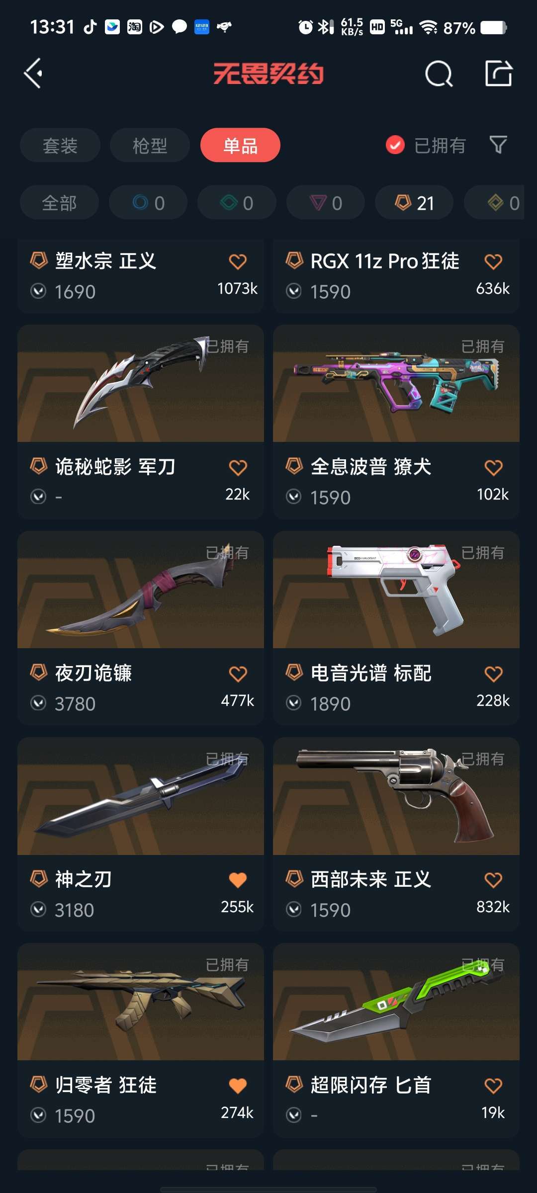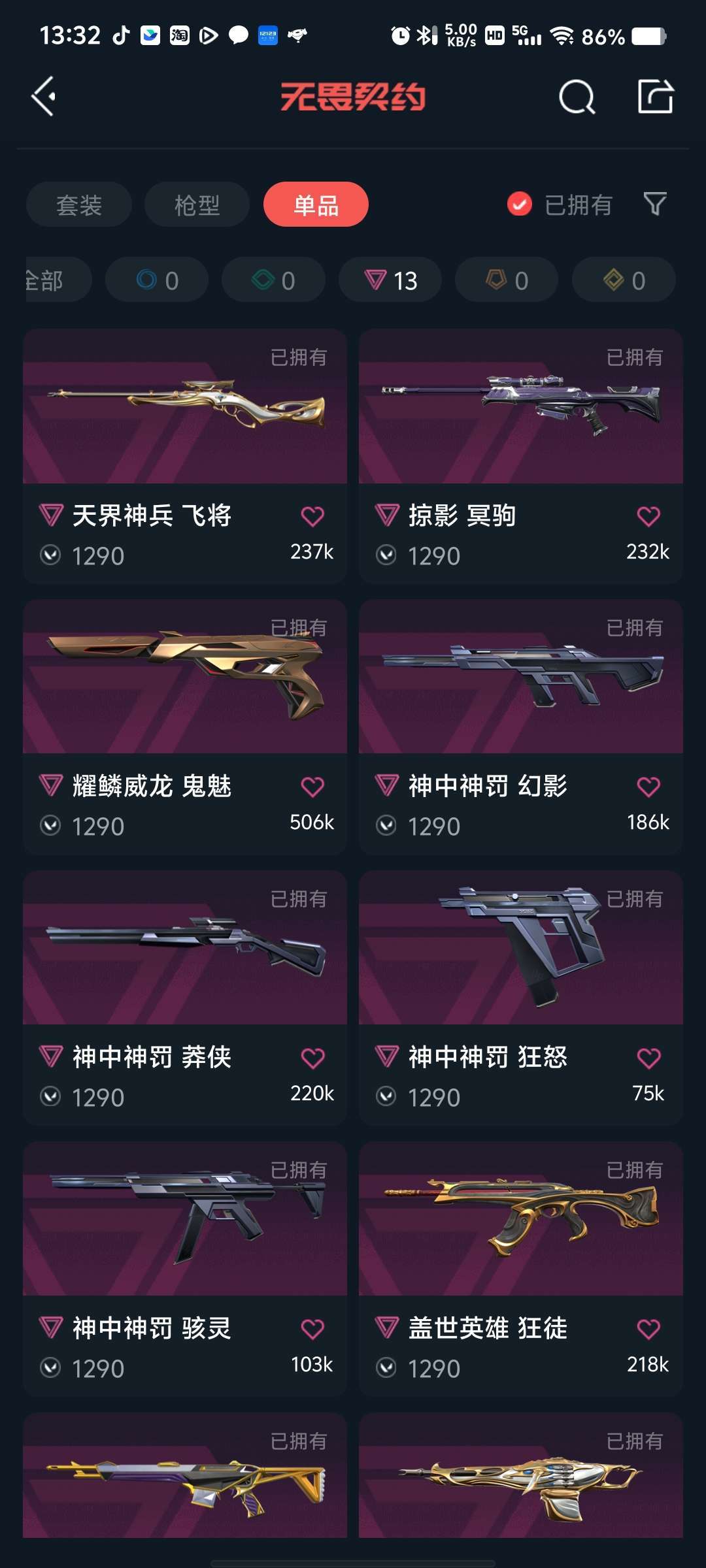 白金三,猫猫狂徒,洪荒怒焰狂徒,超时空卫队狂徒,堕天狂徒,夜刃鬼镰,24冠军,穿花蝴蝶,神中神罚