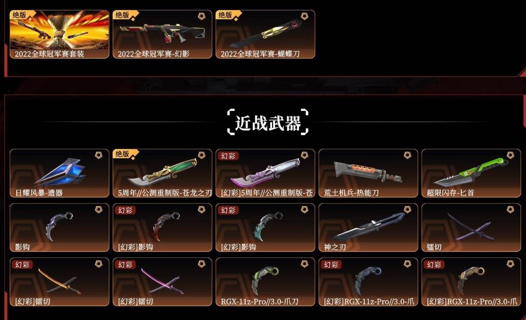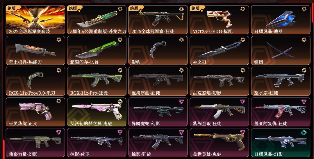 可排位✨5w库存/1500r ✨22/25冠军/ 苍龙之刃✨影钩/神之刃/雷切/显卡爪 ✨ 显卡/混沌/塑水/盖亚/紫金/掠影狂徒✨ 流脓/侦查/魔蛇幻影✨掠影戍卫 ✨ 莲花正义/艾沃莉/盖世鬼魅/VCT标配✨