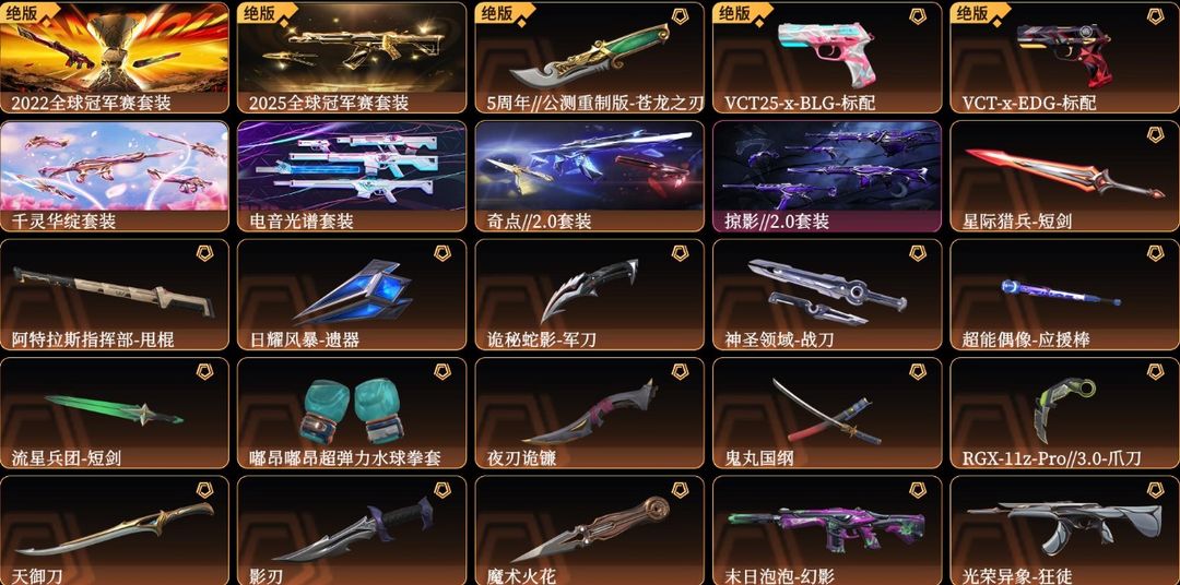 可排位✨皮肤数量160✨掠影//2.0套装✨2022全球冠军赛套装✨电音光谱套装✨千灵华绽套装✨奇点2.0套装✨2025全球冠军赛套装✨苍龙之刃✨✨嘟昂嘟昂超弹力水球拳套✨夜刃诡镰✨鬼丸国纲✨RGX-11z-Pro//3.0-爪刀✨天御刀✨影刃✨魔术火花✨末日泡泡-幻影✨光荣异象-狂徒✨虚空遗器-狂徒✨创·纪元-狂徒✨混沌序曲-狂徒✨黯夜怪谈-幻影✨洪荒怒焰-狂徒✨洪荒怒焰-幻影✨破败军械-戍卫✨塑水宗-狂徒✨艾沃莉的梦之翼-狂徒✨离子武器//2.0-狂徒✨堕天遗武-狂徒✨紫阙金琅-狂徒✨盖亚的复仇-狂徒✨侦察力量-幻影✨海洋之星-狂徒✨日冕雄师-狂徒✨掠影-狂徒✨西部未来-飞将✨RGX-11z-Pro//3.0-莽侠✨上古龙炎-冥驹✨奇点-战神✨艾沃莉的梦之翼-奥丁✨塑水宗-骇灵✨艾沃莉的梦之翼-骇灵✨海洋之星-骇灵✨VCT25-x-BLG-标配✨VCT-x-EDG-标配✨西部未来-正义✨塑水宗-正义✨奇点-正义✨艾沃莉的梦之翼-鬼魅✨神中神罚-狂怒✨天界神兵-鬼魅✨耀鳞威龙-鬼魅