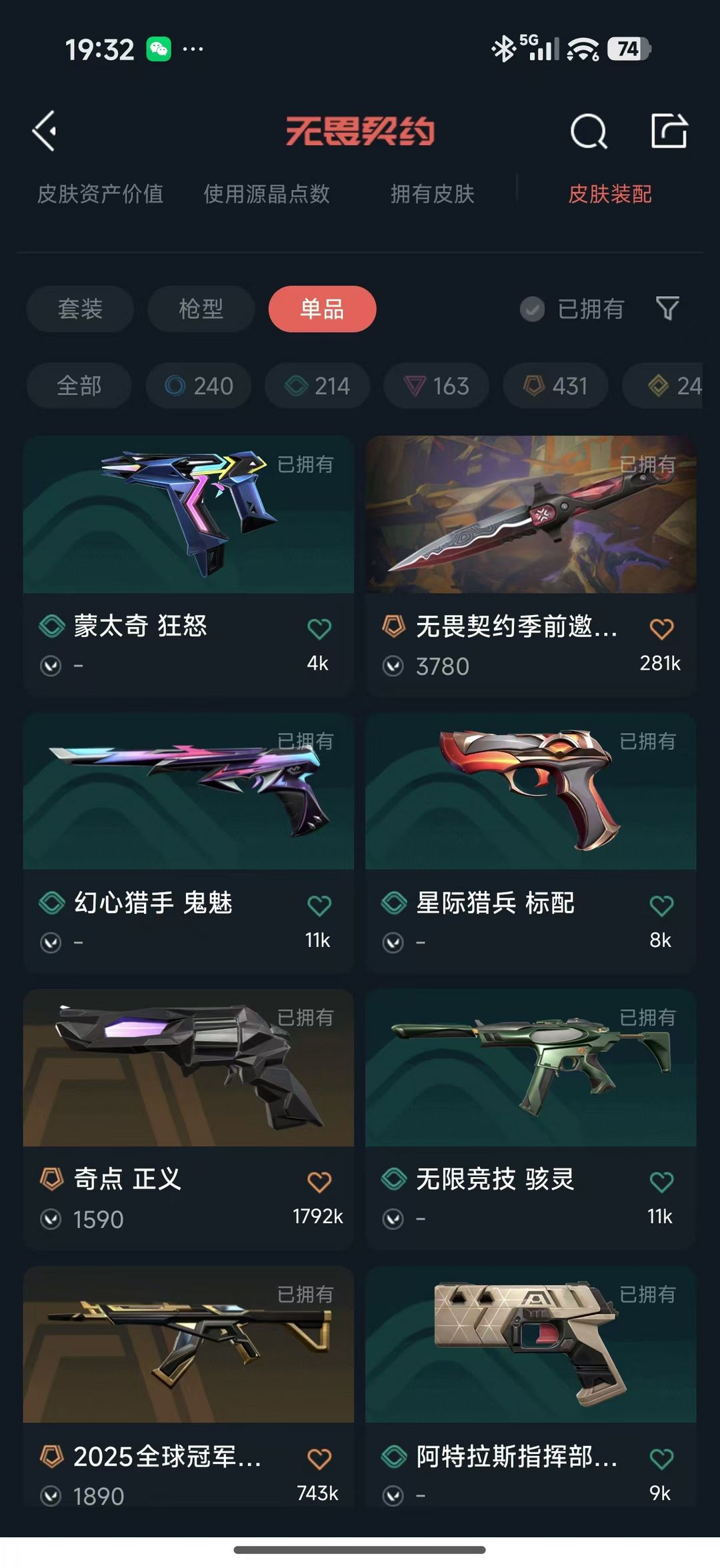 奇点 正义 步枪:2022全球冠军赛 幻影;耀鳞威龙 狂徒;侦察力量 幻影;源能者危机001 幻影;2025全球冠军赛 狂徒;盖亚的复仇 狂徒 狙击步枪:千灵华绽 冥驹 近战武器:悲悯之刃;堕天遗武 仪式匕首;奇点//2.0 蝴蝶刀;VCT 2025 爪刀