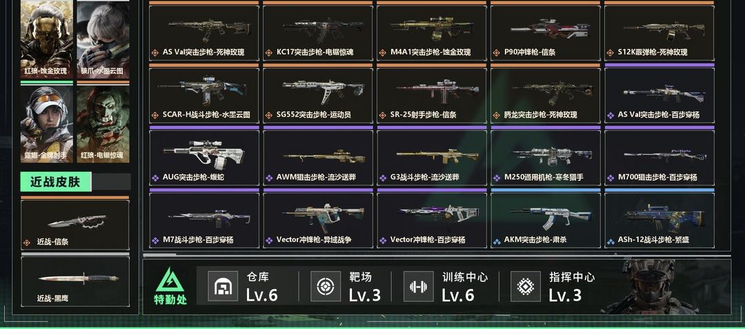 【步枪皮肤】AS Val突击步枪-死神玫瑰/G3战斗步枪-流沙送葬/M7战斗步枪-百步穿杨/KC17突击步枪-电锯惊魂/SCAR-H战斗步枪-水墨云图/M4A1突击步枪-蚀金玫瑰/AUG突击步枪-蝮蛇/SG552突击步枪-运动员/腾龙突击步枪-死神玫瑰