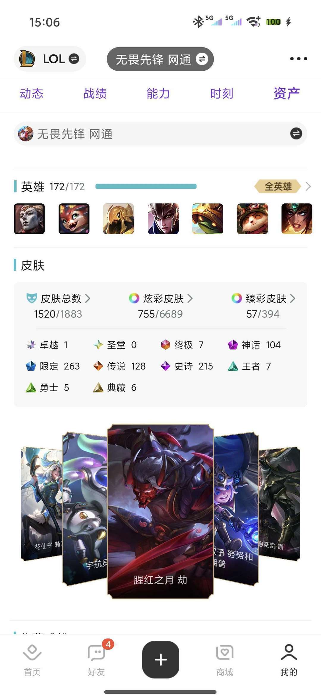 网四无畏先锋,联盟五区,皮肤1500个,炫彩755,臻彩57个