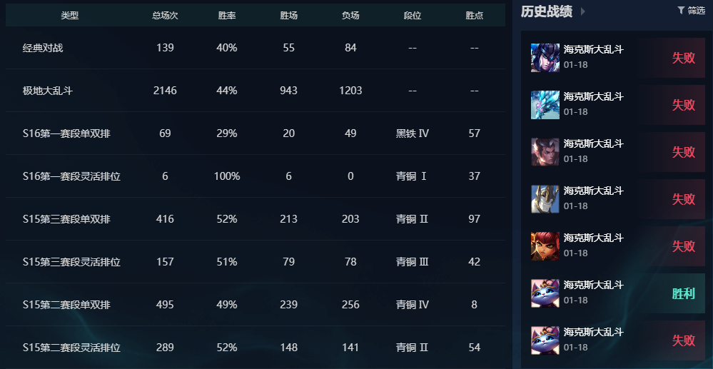 艾欧尼亚❤️1000皮可排位❤️S16赛季单双青铜❤️灵活白银❤️海克斯乱斗胜率❤️极品虐菜号