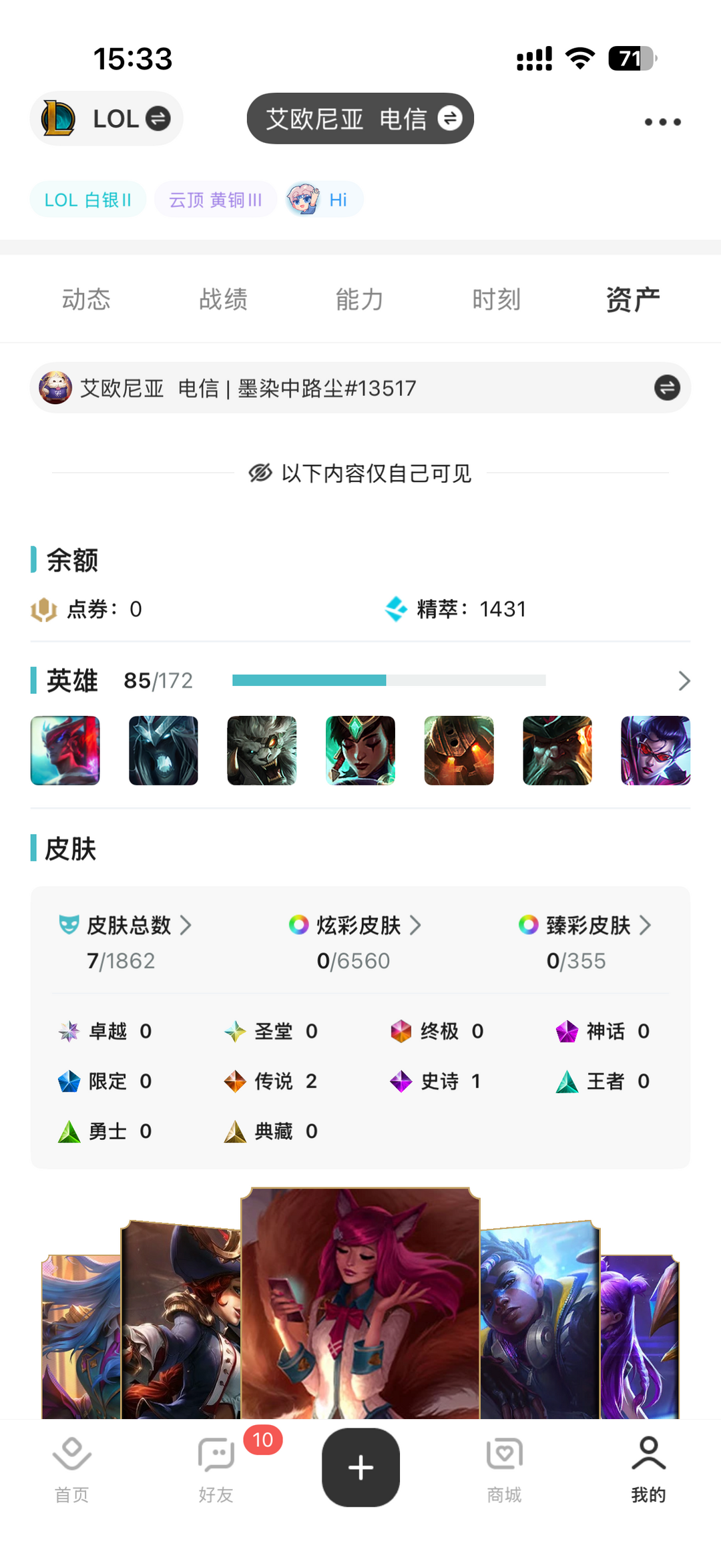 艾欧尼亚电信区LOL账号,段位为不屈白银II,云顶黄铜III。总场次43场,大乱斗胜率80%、匹配胜率52.3%,单双排9场胜率44.4%。账号拥有85个英雄,7款皮肤(含2款传说、1款史诗),点券0、精萃1431,可正常进行排位、匹配、大乱斗等模式,体验中路等位置玩法,适合白银分段玩家体验对局。