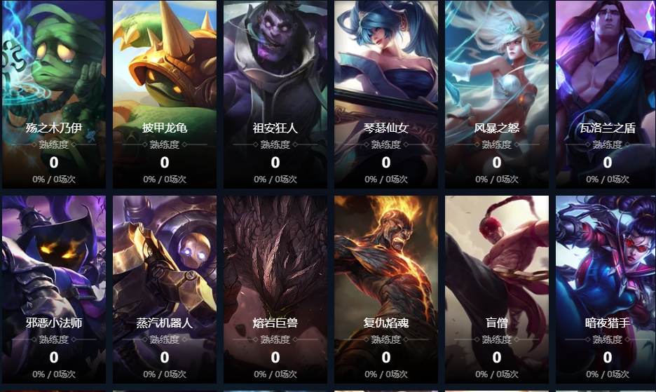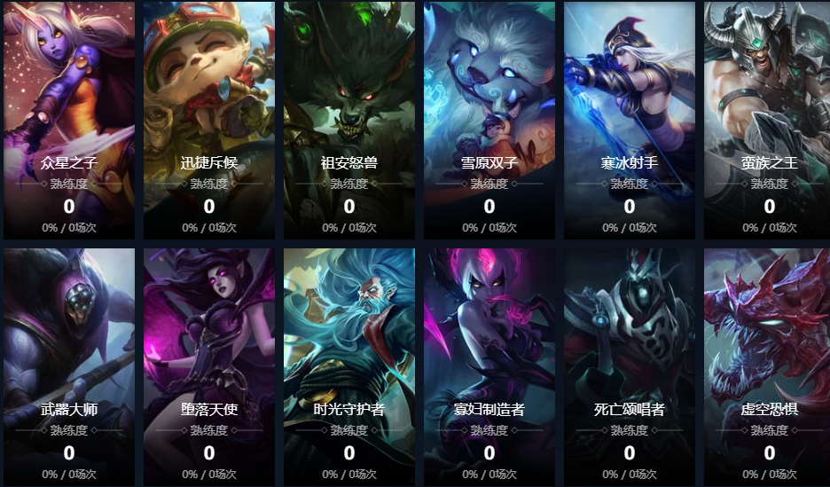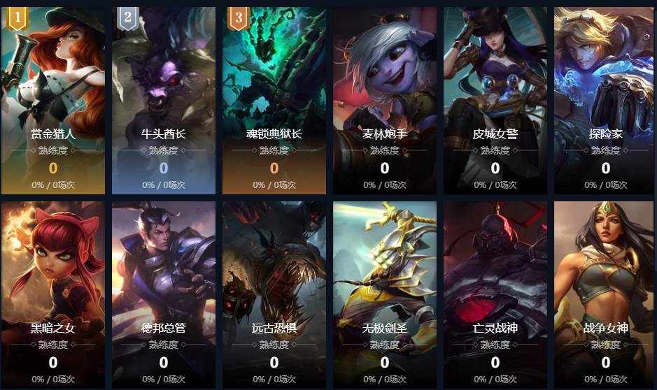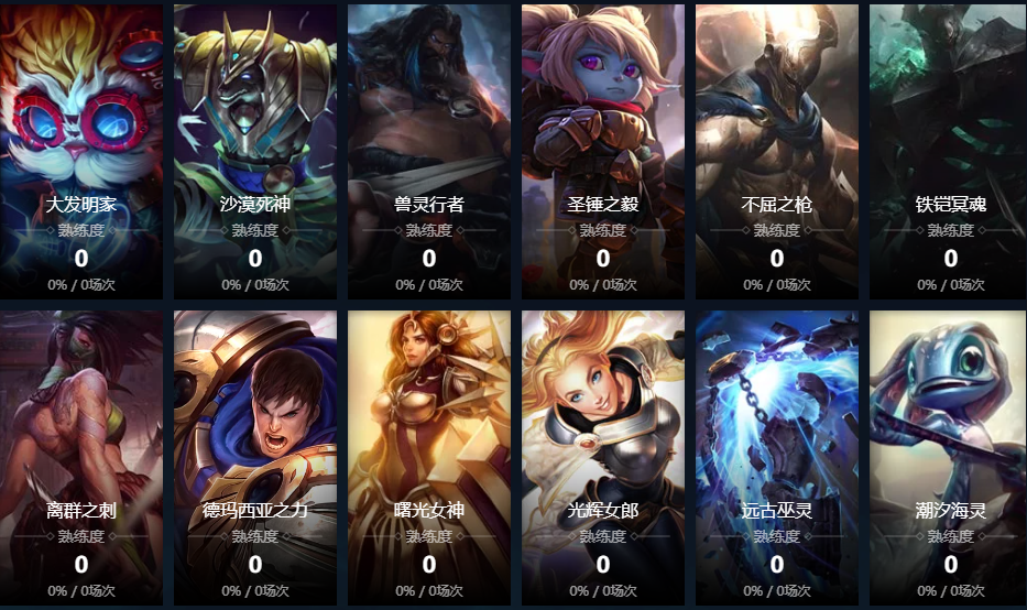 德玛西亚之力;爆破鬼才;潮汐海灵;仙灵女巫;黑暗之女;狂战士;正义巨像;卡牌大师;德邦总管;无畏战车;远古恐惧;正义天使;无极剑圣;牛头酋长;战争女神;众星之子;迅捷斥候;麦林炮手;祖安怒兽;雪原双子;赏金猎人;寒冰射手;蛮族之王;堕落天使;时光守护者;炼金术士;死亡颂唱者;虚空恐惧;殇之木乃伊;披甲龙龟;冰晶凤凰;祖安狂人;琴瑟仙女;虚空行者;天启者;邪恶小法师;巨魔之王;诺克萨斯统领;皮城女警;蒸汽机器人;熔岩巨兽;永恒梦魇;荒漠屠夫;复仇焰魂;盲僧;暗夜猎手;沙漠死神;圣锤之毅;酒桶;不屈之枪;铁铠冥魂;曙光女神;刀锋之影;放逐之刃;光辉女郎;龙血武姬;法外狂徒;不灭狂雷;深海泰坦;北地之怒;虚空掠夺者;诺克萨斯之手;冰霜女巫;皎月女神;铸星龙王;暮光星灵;虚空之女;迷失之牙;生化魔人;虚空之眼;虚空女皇;戏命师;破败之王;涤魂圣枪;影流之主;皮城执法官;暗裔剑魔;唤潮鲛姬;魔法猫咪;魂锁典狱长;山隐之焰;解脱者;万花通灵;血港鬼影;腕豪;纳祖芒荣耀;不落魔锋