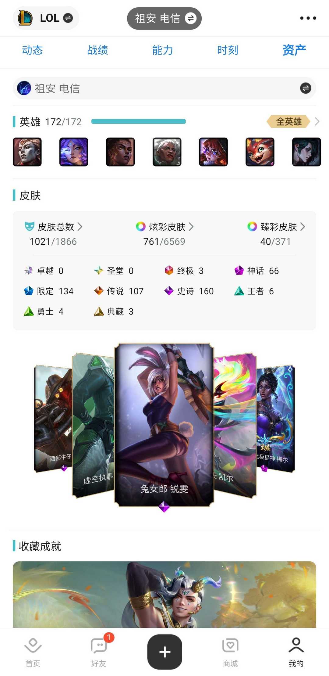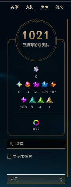 全英雄 1021皮肤 677炫彩 40臻彩3终极 66神话 134限定 107传说 160史诗