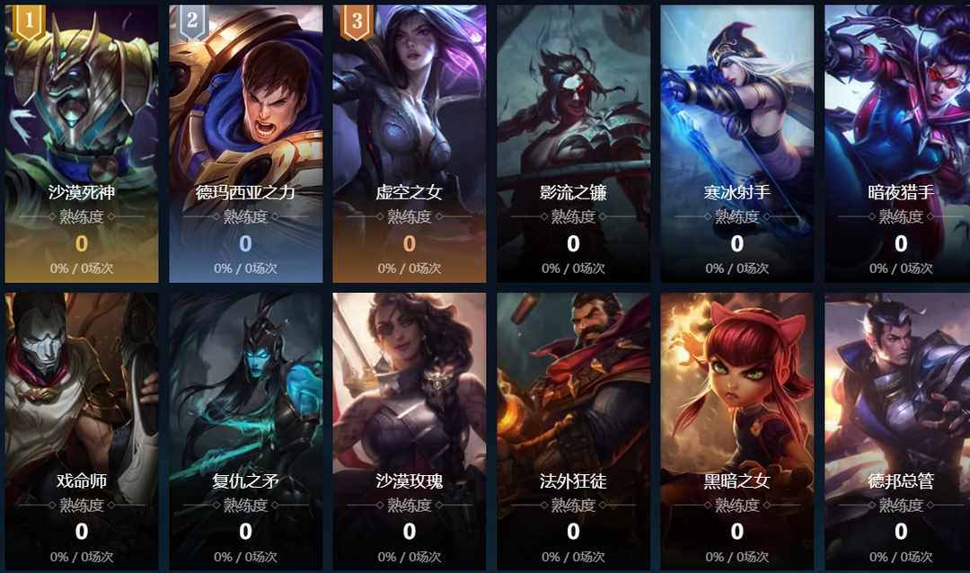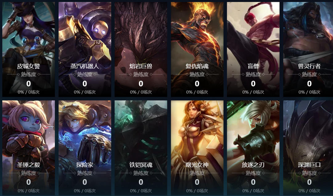 皮城女警;迅捷斥候;寒冰射手;麦林炮手;赏金猎人;探险家;黑暗之女;德邦总管;远古恐惧;无极剑圣;牛头酋长;亡灵战神;战争女神;众星之子;祖安怒兽;雪原双子;蛮族之王;武器大师;堕落天使;时光守护者;痛苦之拥;虚空恐惧;殇之木乃伊;披甲龙龟;祖安狂人;琴瑟仙女;刀锋舞者;风暴之怒;海洋之灾;天启者;瓦洛兰之盾;邪恶小法师;诺克萨斯统领;蒸汽机器人;熔岩巨兽;荒漠屠夫;德玛西亚皇子;齐天大圣;复仇焰魂;盲僧;暗夜猎手;沙漠死神;兽灵行者;圣锤之毅;不屈之枪;铁铠冥魂;德玛西亚之力;曙光女神;放逐之刃;光辉女郎;远古巫灵;龙血武姬;九尾妖狐;潮汐海灵;不灭狂雷;北地之怒;爆破鬼才;仙灵女巫;虚空掠夺者;诺克萨斯之手;皎月女神;影流之镰;虚空之女;疾风剑豪;戏命师;暴走萝莉;河流之王;涤魂圣枪;圣枪游侠;影流之主;时间刺客;皮城执法官;魔法猫咪;沙漠玫瑰;魂锁典狱长;解脱者;万花通灵;封魔剑魂;腕豪;炽炎雏龙;不落魔锋;百裂冥犬
