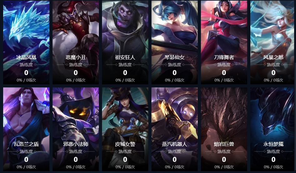 残月之肃;戏命师;双界灵兔;德玛西亚之力;祖安狂人;无双剑姬;冰晶凤凰;复仇焰魂;光辉女郎;皎月女神;诡术妖姬;正义天使;无极剑圣;麦林炮手;雪原双子;赏金猎人;寒冰射手;痛苦之拥;瘟疫之源;死亡颂唱者;殇之木乃伊;琴瑟仙女;刀锋舞者;英勇投弹手;皮城女警;蒸汽机器人;熔岩巨兽;德玛西亚皇子;齐天大圣;盲僧;暗夜猎手;圣锤之毅;探险家;离群之刺;曙光女神;不灭狂雷;北地之怒;虚空掠夺者;诺克萨斯之手;虚空之女;星籁歌姬;疾风剑豪;破败之王;涤魂圣枪;影流之主;暗裔剑魔;沙漠玫瑰;魂锁典狱长;万花通灵;血港鬼影;不羁之悦;纳祖芒荣耀