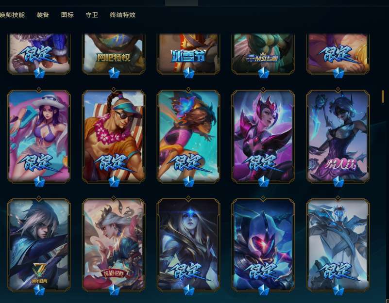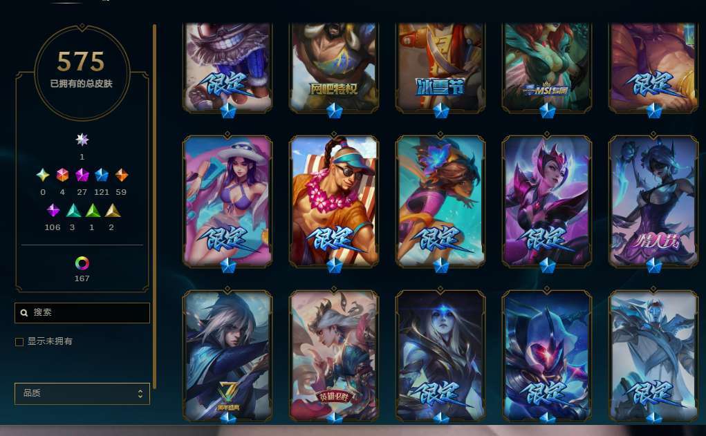 主玩下路,AD都有高质量皮肤,卡莎 vn全皮,龙年皮肤全套,其他路皮肤也都有,皮肤都是买的,质量很好