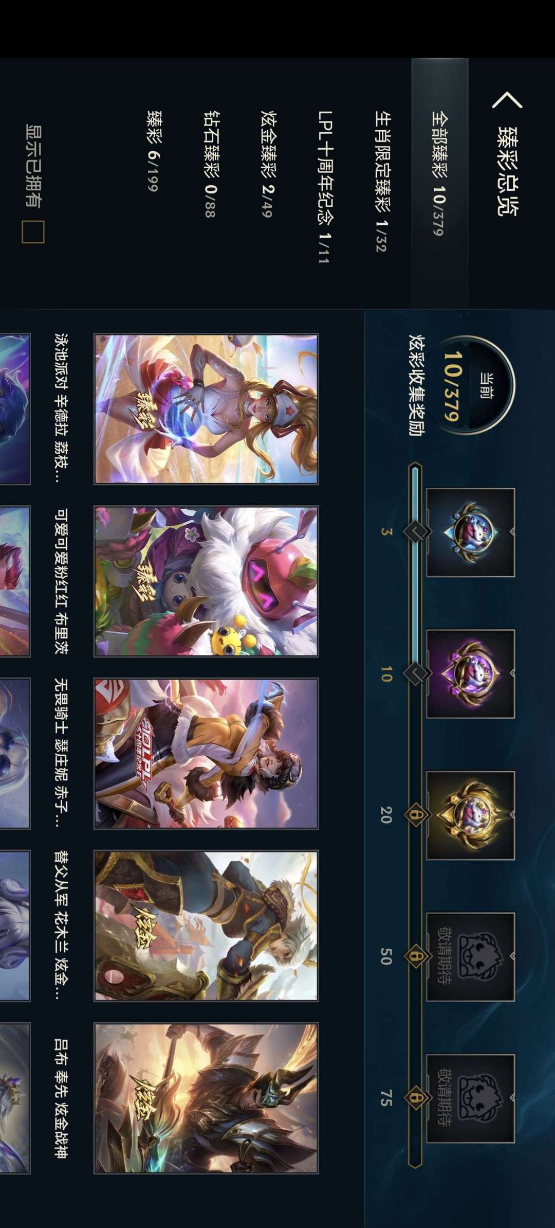 斗魂觉醒(莎弥拉),武装战姬(厄运小姐),未来战士(伊泽瑞尔)。 亚托克斯、婕拉、亚索、凯隐(至臻),灰烬骑士(派克)。 雷克顿、斯维因、薇恩、阿利斯塔(海克斯科技)。 锐雯,嘉文四世,莫甘娜,娑娜,孙悟空,凯特琳,盖伦,瑟提,斯莫德(年限) 吕布炫金战神、花木兰炫金龙刃