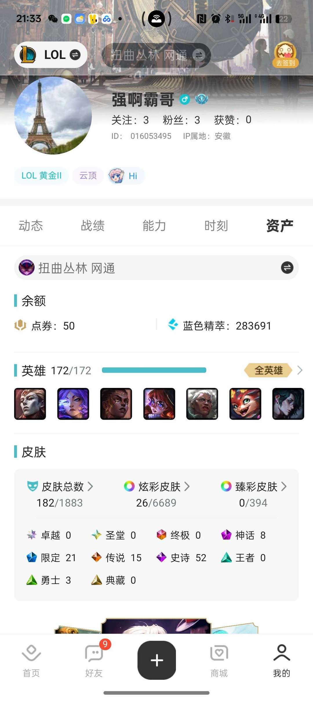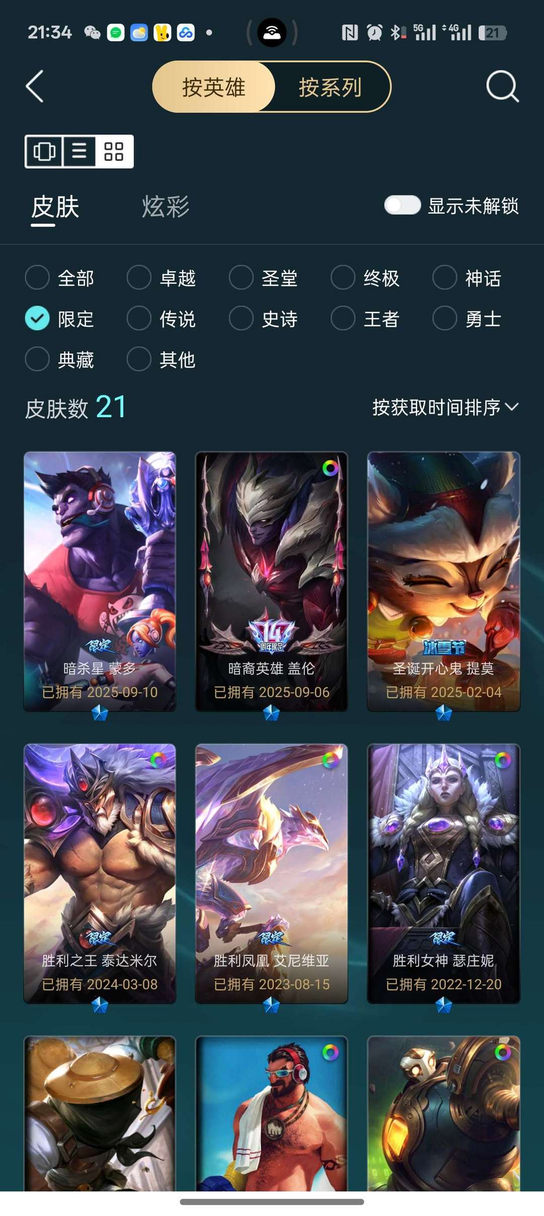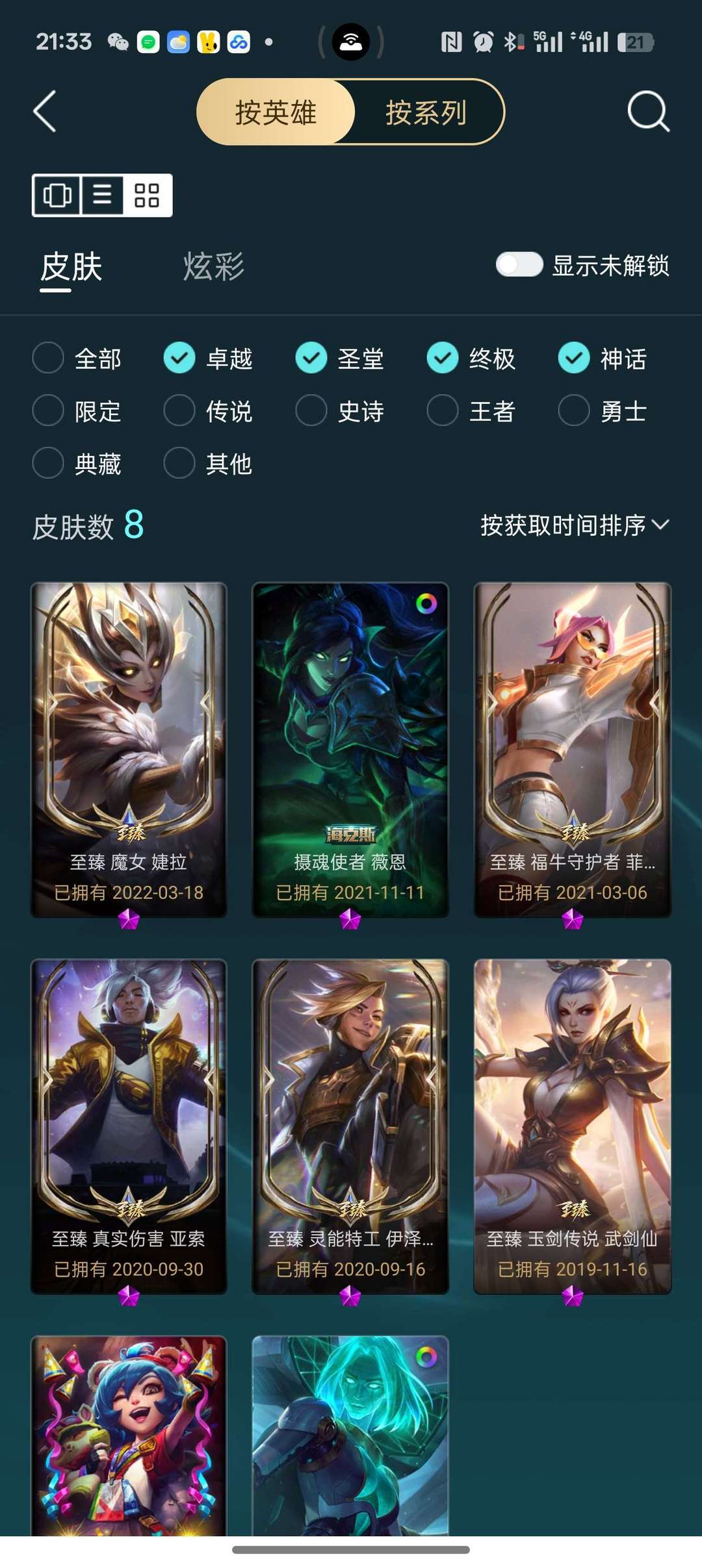 5至臻8神话21限定15传说52史诗182皮肤全英雄可排位,个人账号,以前一直在玩,更新海克斯大乱斗通行证后不玩了