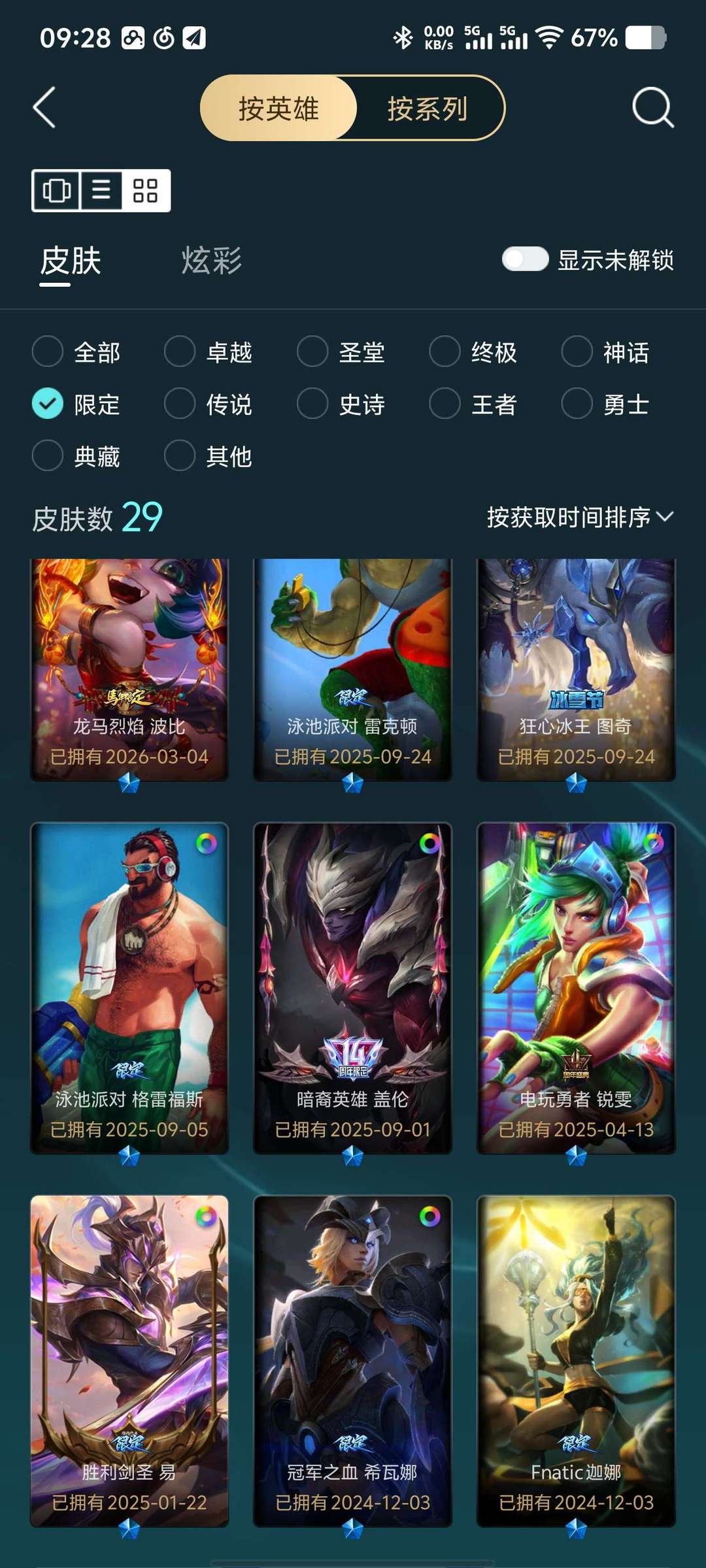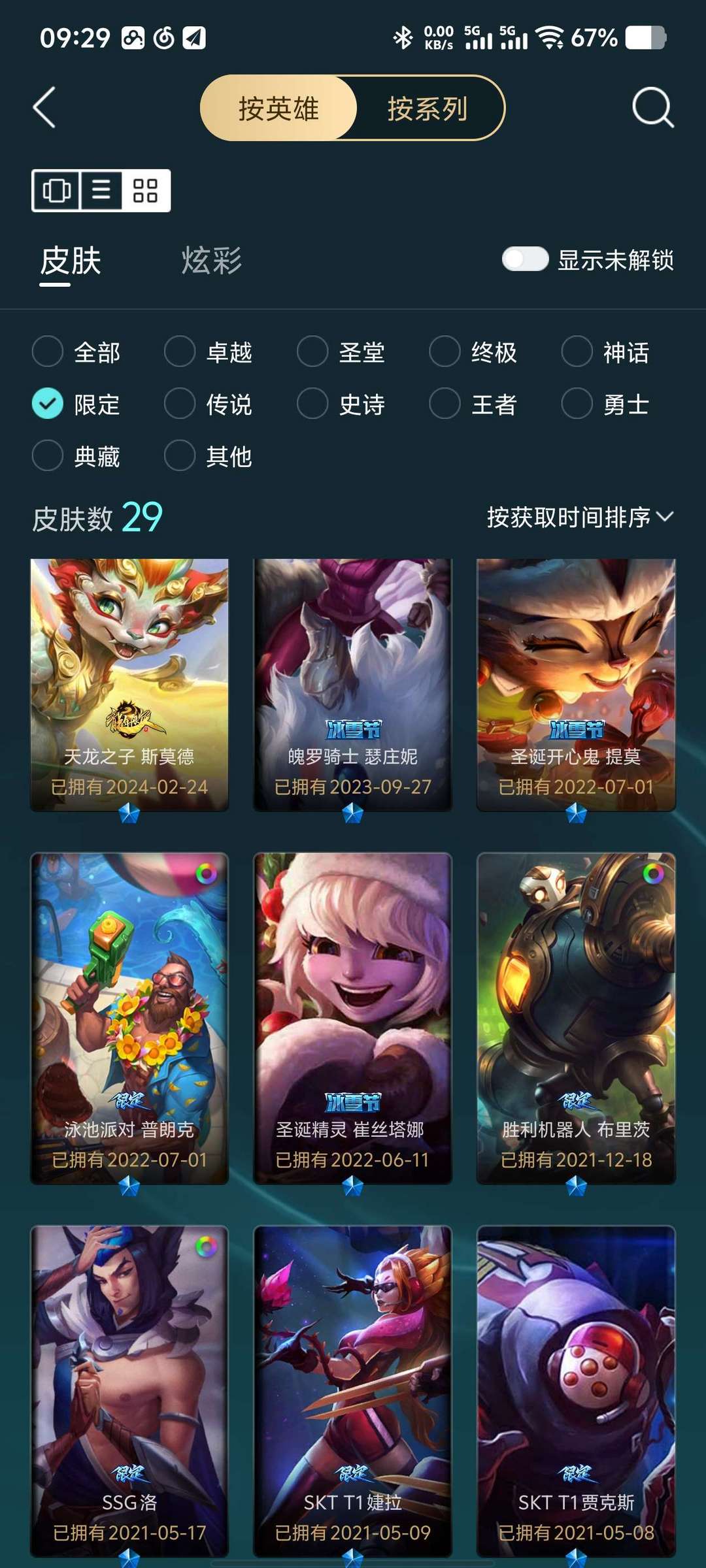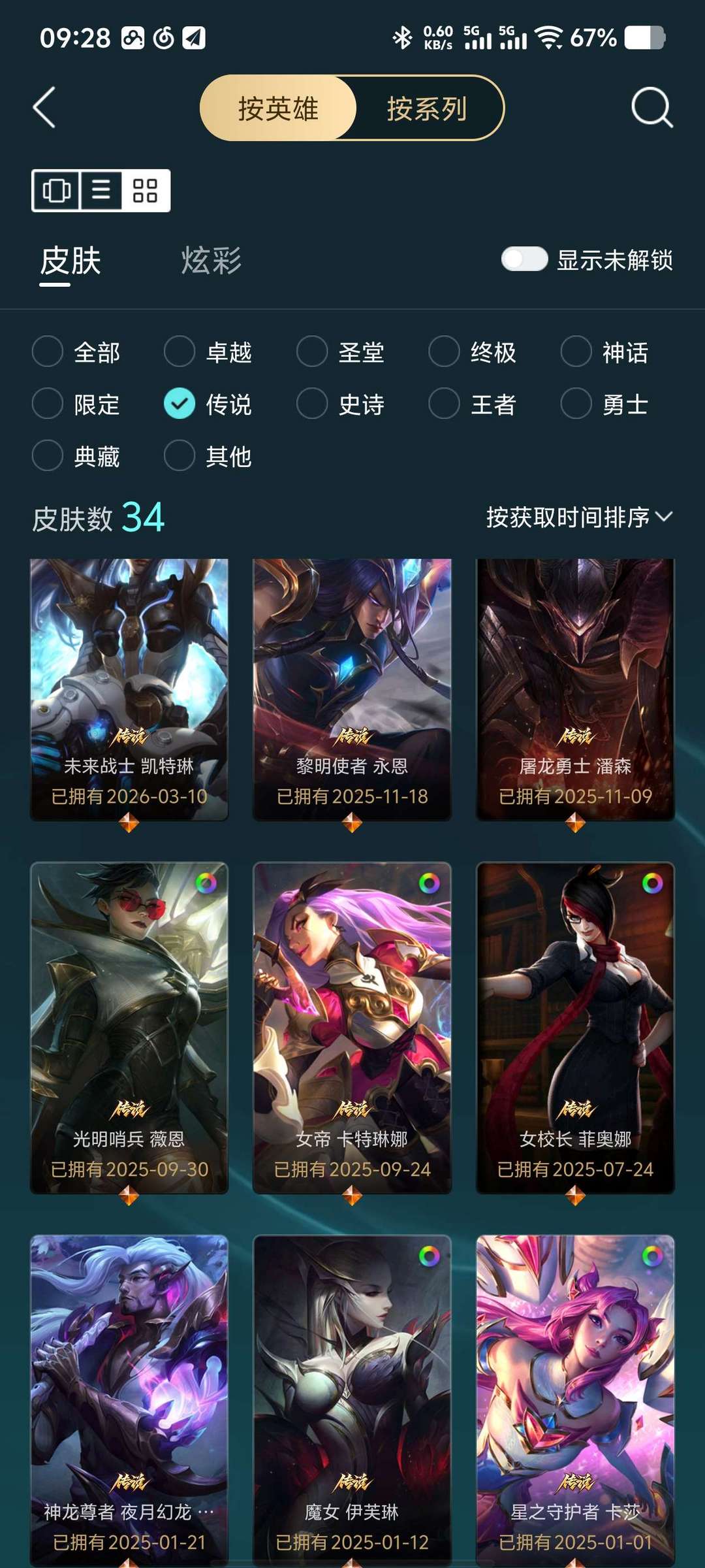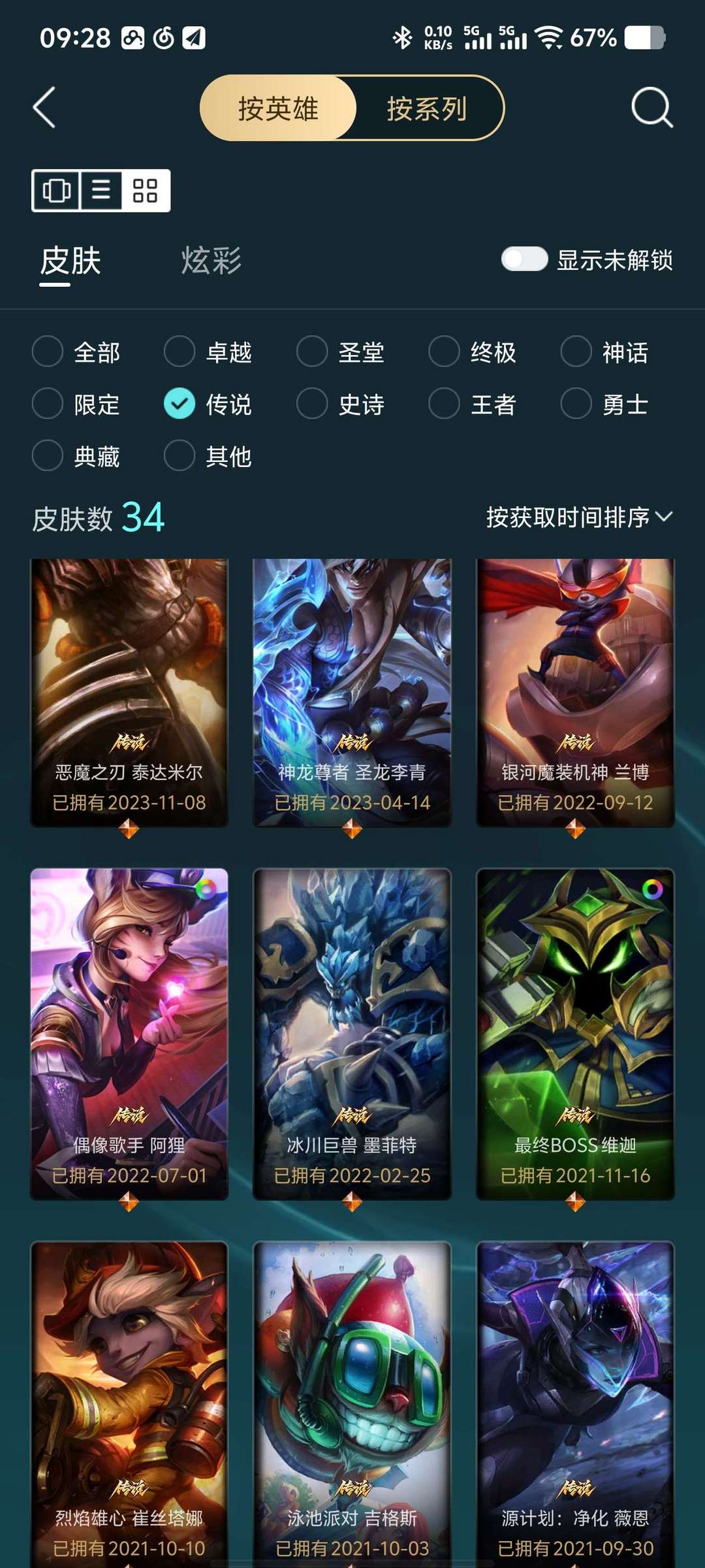 283个皮肤 13个至臻皮肤 29个限定皮肤 34个传说皮肤