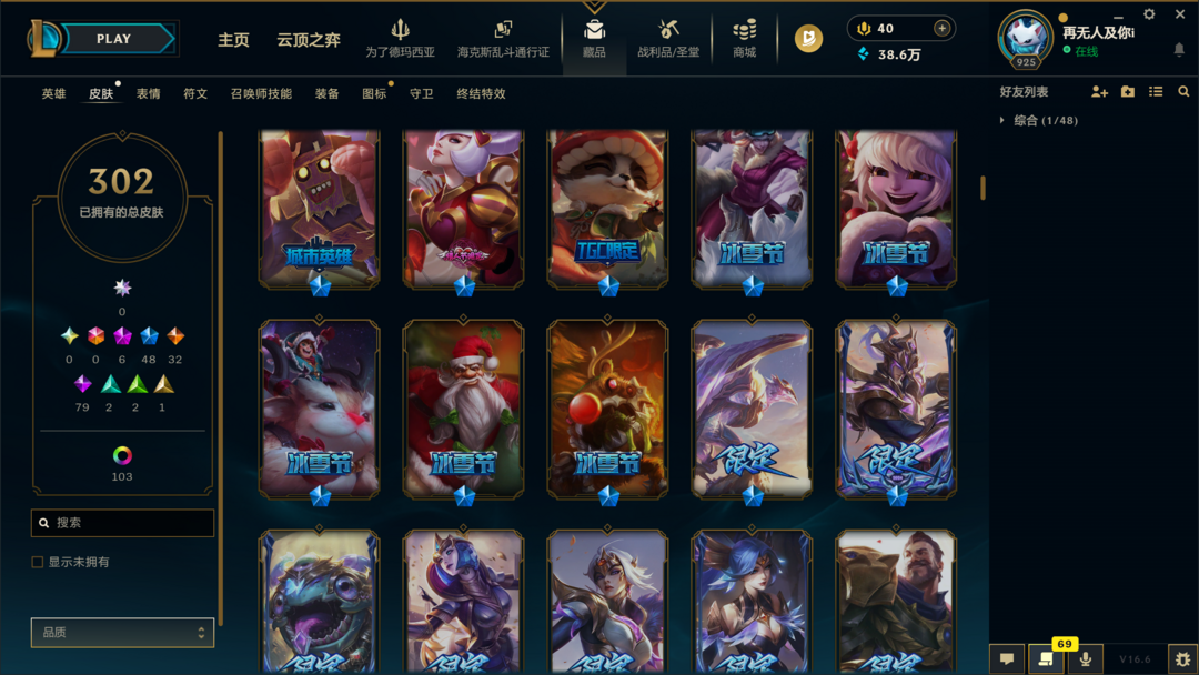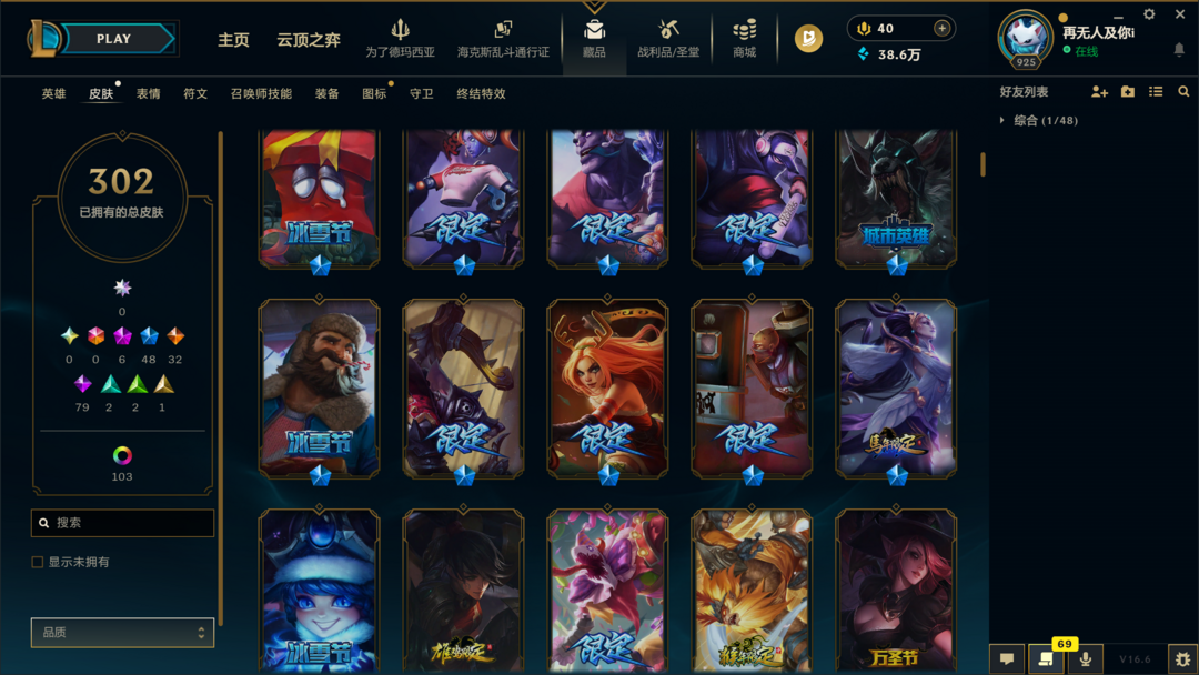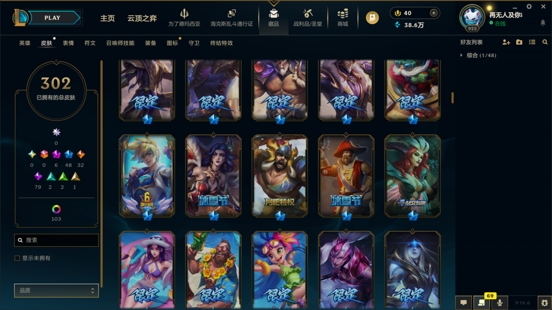 可排位400皮肤〓10至臻海克斯〓神王幻灵〓泳池派对〓冰雪节限定