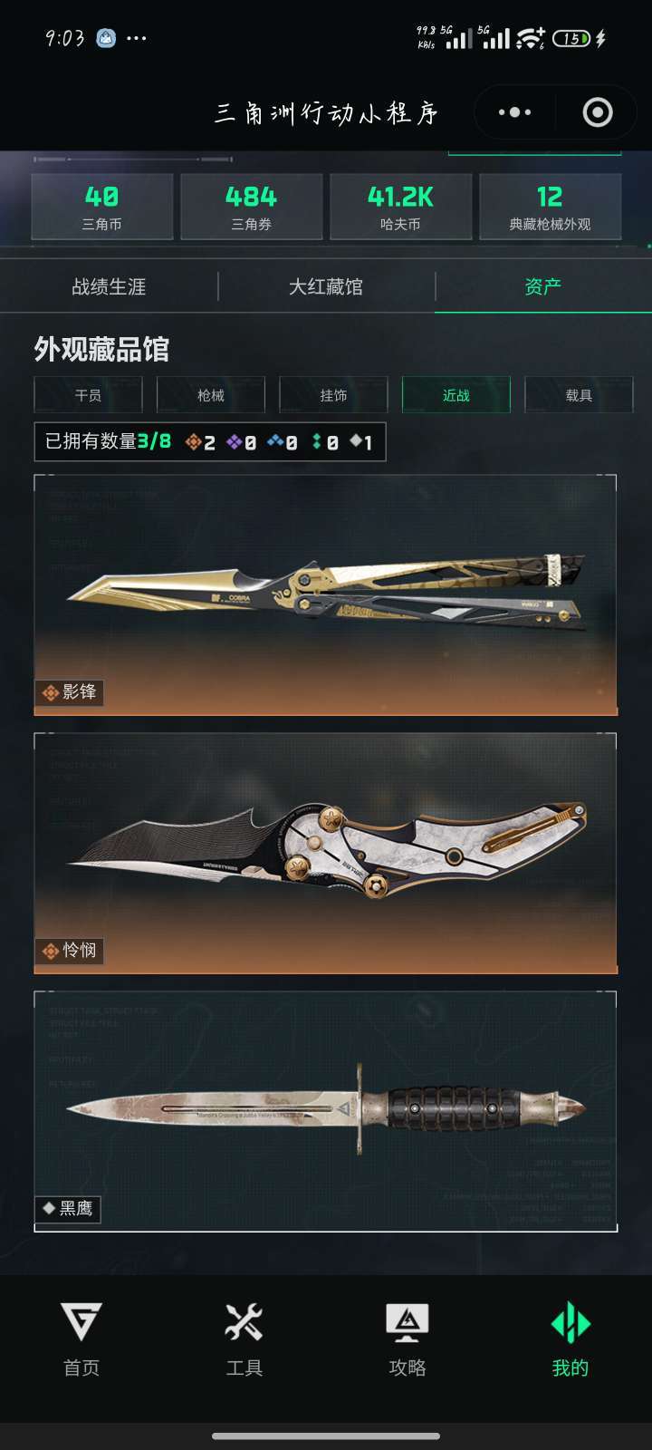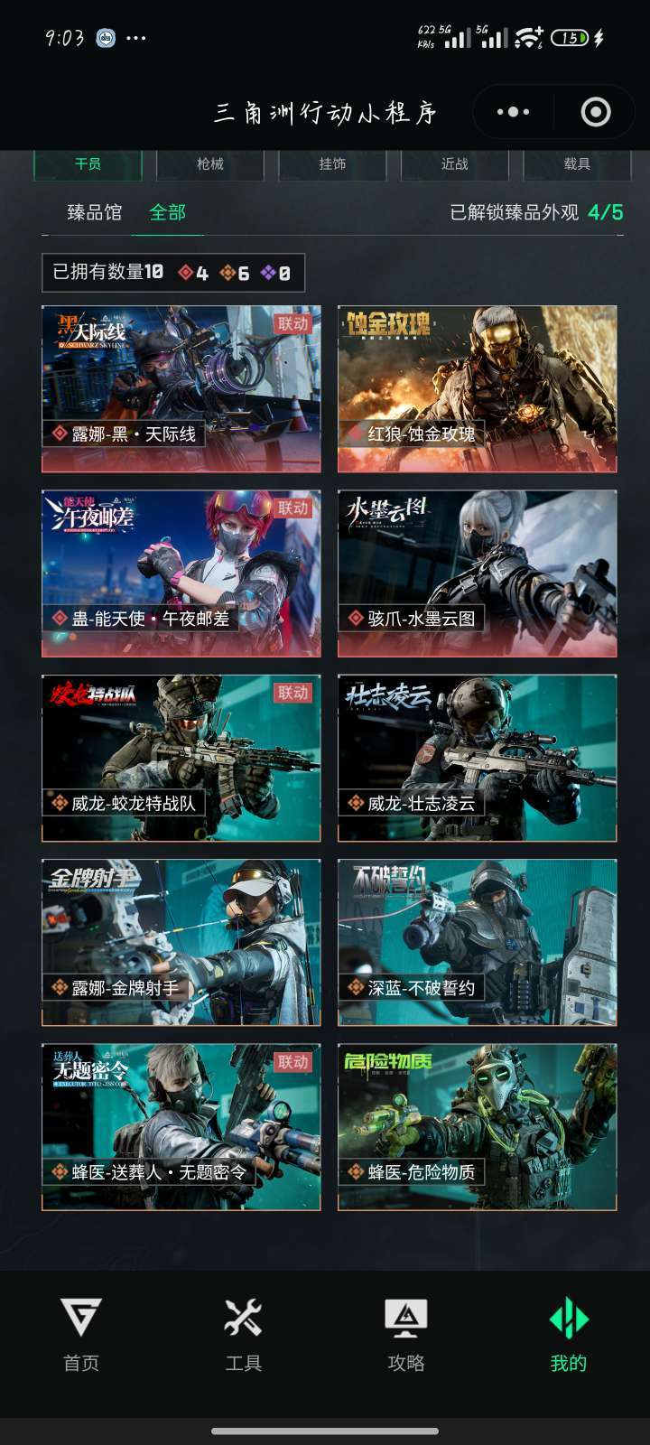 干员红皮有水墨云图、饰金玫瑰、黑天际线、能天使午夜邮差,刀皮有影锋、怜悯