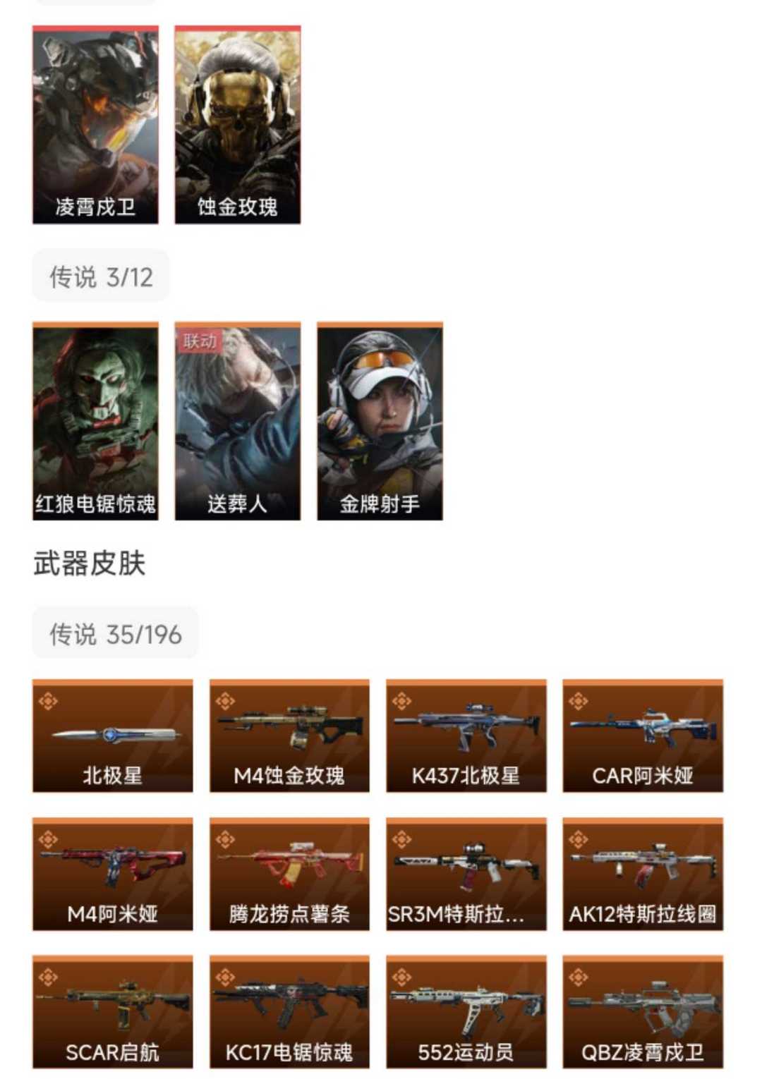 皮肤号 凌霄戍卫,蚀金玫瑰,北极星,35款传说枪皮,s8赛季3×3保险箱