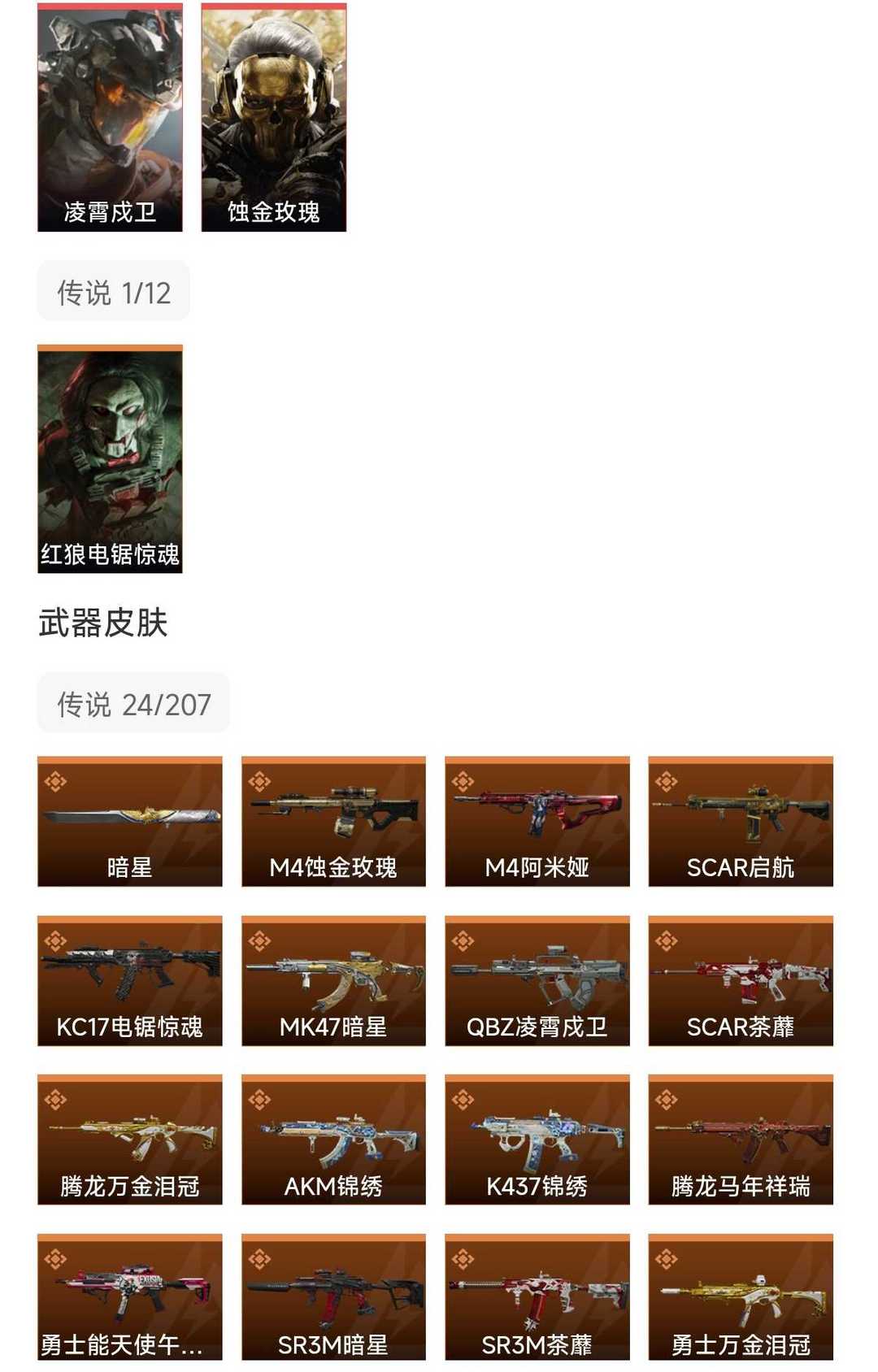 皮肤号 暗星,凌霄戍卫,蚀金玫瑰,24款传说枪皮