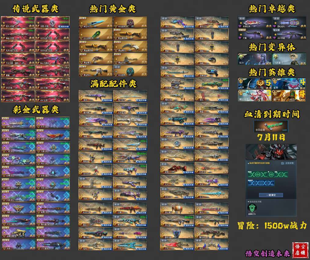 【英雄配件武器】: 浮光 曜弦 崩雷伯言 渊瞳 归墟血契 星斗天际 寂灭 月隐 奏鸣 鬼刃修罗 藤木蔓芯 幻宇星涡 尘埃 绝境 弧光 跳跳锤 核子裂变 迷你派拉 裂隙行者 伏虎 盖亚 野兽 玄天 灵狩 不朽 终末之弩 寂静白龙 花束 原石之力(可原地复活)原石之怒 幻锋 螳螂臂 浪淘沙 翎羽 风暴 破空英勇比伯 陷阵无踪 冰河猎犬霓虹旋风 禁止通行 极寒体验