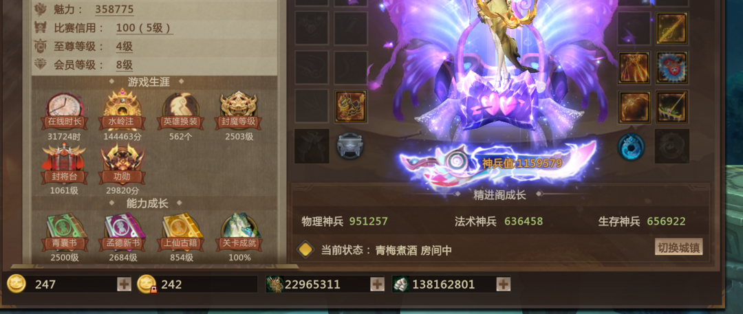 青梅区117万神兵+至尊4 皮肤562+3神话+新活动3个皮肤 1039破520爆伤 士兵2200万 兵粮 1.3亿 诸天灭 金星月 金星海 星海 神剑 灯管 最佳情人 钉耙 幻神 30万魅力套 双进阶翅膀坐骑 大圣 九尾 猪猪 小象 兔子 战力套 改名卡详细看图 细节上号