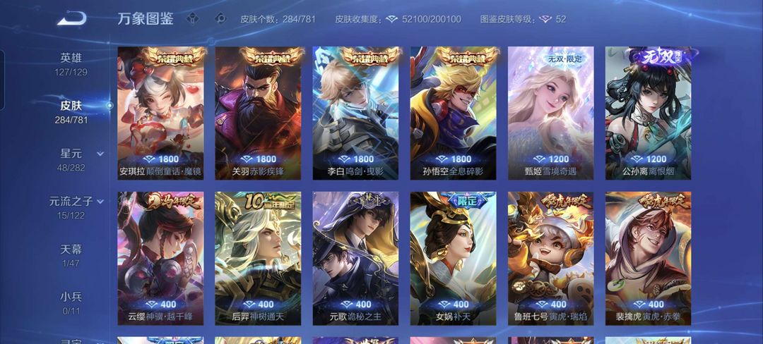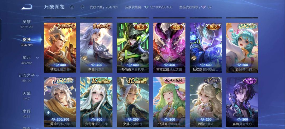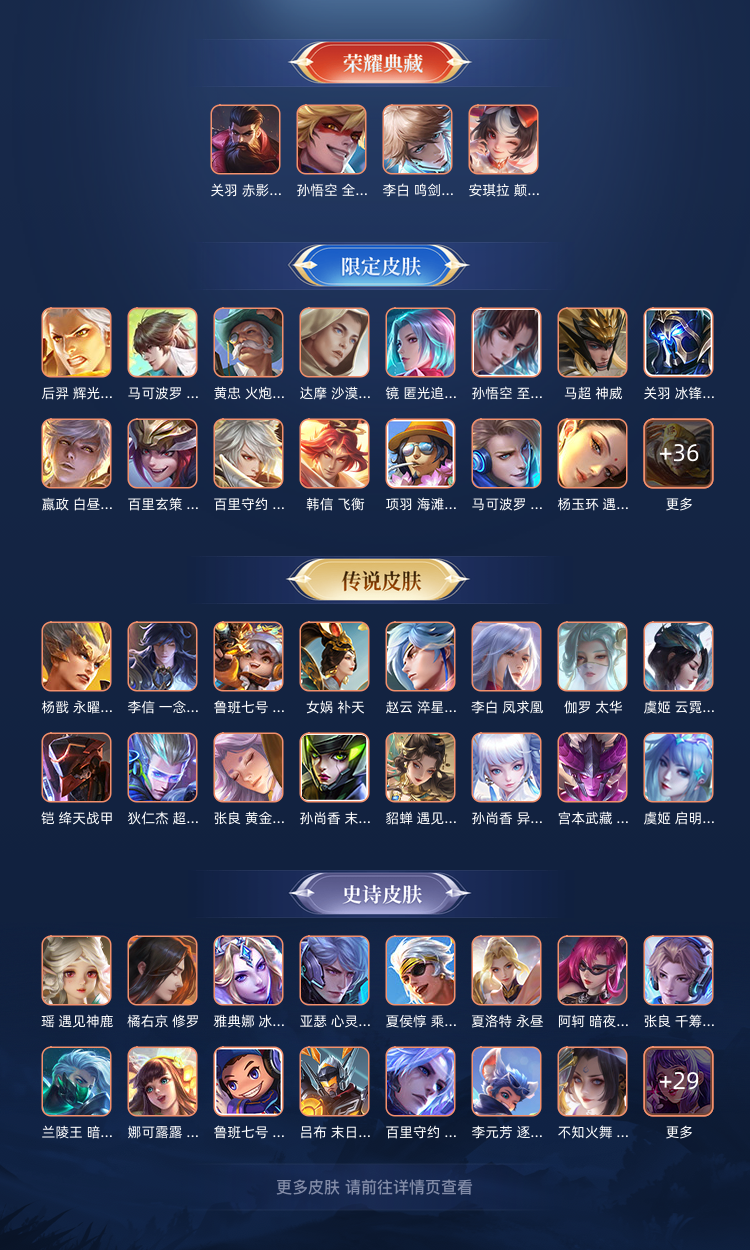 本游戏账号,英雄多,皮肤多。,感受典藏皮肤带来的优质体验快感 私人所属英雄皮肤有:李白 鸣剑·曳影||孙悟空 全息碎影 安琪拉新典藏,云缨年限,公孙离无双,狄仁杰 超时空战士||孙尚香 末日机甲||王昭君 乞巧织情||张良 黄金白羊座百里守约 朱雀志||百里玄策 白虎志||达摩 沙漠行僧||关羽 冰锋战神||韩信 飞衡||后羿 辉光之辰||黄忠 火炮绅士||李白 凤求凰||鲁班七号 寅虎·瑞焰||马可波罗 山海·玄木吟||女娲 补天||孙悟空 至尊宝||杨戬 永曜之星||嬴政 白昼王子||虞姬 云霓雀翎||赵云 淬星耀世||伽罗 太华||李信 一念神魔||马超 神威||镜 匿光追影者,等等