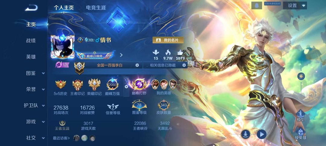 本游戏账号: V7用户,基础段位:最强王者,英雄多,皮肤多。典藏皮肤1个,感受典藏皮肤带来的优质体验快感,FMVP皮肤4个,尽情享受FMVP皮肤带来的主角光环, 私人所属英雄皮肤有:李白 鸣剑·曳影孙悟空 地狱火||孙尚香 末日机甲马超 无双飞将||镜 炽阳神光||曜 云鹰飞将||貂蝉 猫影幻舞雅典娜 黎明之约||达摩 沙漠行僧||公孙离 祈雪灵祝||芈月 白晶晶||孙悟空 零猎||马超 神威||赵云 龙胆||孙悟空 至尊宝||韩信 飞衡||李白 凤求凰||妲己 时之彼端||女娲 朔望之晖||干将莫邪 冰霜恋舞曲||嬴政 白昼王子||孙悟空 大圣娶亲||露娜 一生所爱||百里玄策 白虎志||关羽 冰锋战神,等等